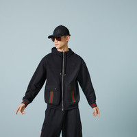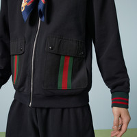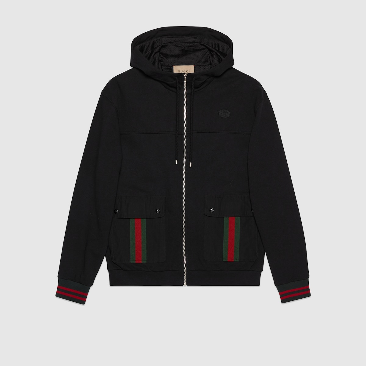 Blending contemporary designs with signature details from the House's heritage, menswear offers versatile and unique pieces ideal for the arrival of a new season. The Pre-Fall collection spotlights this black felted cotton jersey hooded jacket with Interlocking G embroidered patch. - Black felted cotton jersey - Interlocking G embroidered patch - Green and red Web canvas stripe - Fixed hood with drawstring - Two side patch pockets - Striped rib trim - Back length: 26,3"; based on size M - Zip closure - Regular fit - Made in Italy - The model is 6'1" and is wearing size medium - Shoulder width: 20,6"; based on a size M
