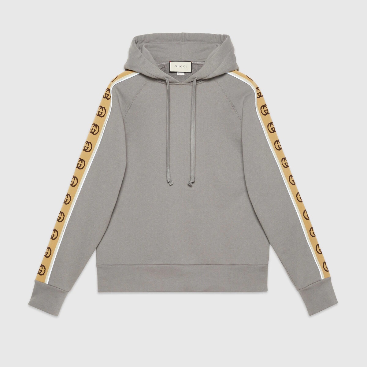 A distinctive detail of Gucci's latest collections, the Interlocking G stripe runs down the sleeves of this hooded sweatshirt, crafted from grey cotton jersey. Reminiscent of logo tapes typically found on vintage tracksuits, the side band serves as a sporty play on the historical Gucci logo. - Grey heavy felted organic cotton jersey - Camel and brown Interlocking G jacquard stripe down the sleeves with reflective fabric piping - This product contains organic cotton where the cultivation and manufacturing process restrict the use of chemicals, eliminate pesticides or artificial fertilizers and incorporate methods that respect biodiversity, improve soil quality, and reduce water consumption. - Fixed hood - Made in Italy