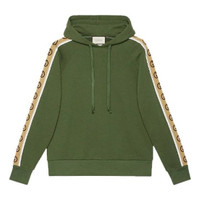 A distinctive detail of Gucci's latest collections, the Interlocking G stripe runs down the sleeves of this hooded sweatshirt, crafted from green cotton jersey. Reminiscent of logo tapes typically found on vintage tracksuits, the side band serves as a sporty play on the historical Gucci logo. - Green heavy felted organic cotton jersey - Camel and brown Interlocking G jacquard stripe down the sleeves with reflective fabric piping - This product contains organic cotton where the cultivation and manufacturing process restrict the use of chemicals, eliminate pesticides or artificial fertilizers and incorporate methods that respect biodiversity, improve soil quality, and reduce water consumption. - Fixed hood - 100% organic cotton - Made in Italy - The product shown in this image is a size small