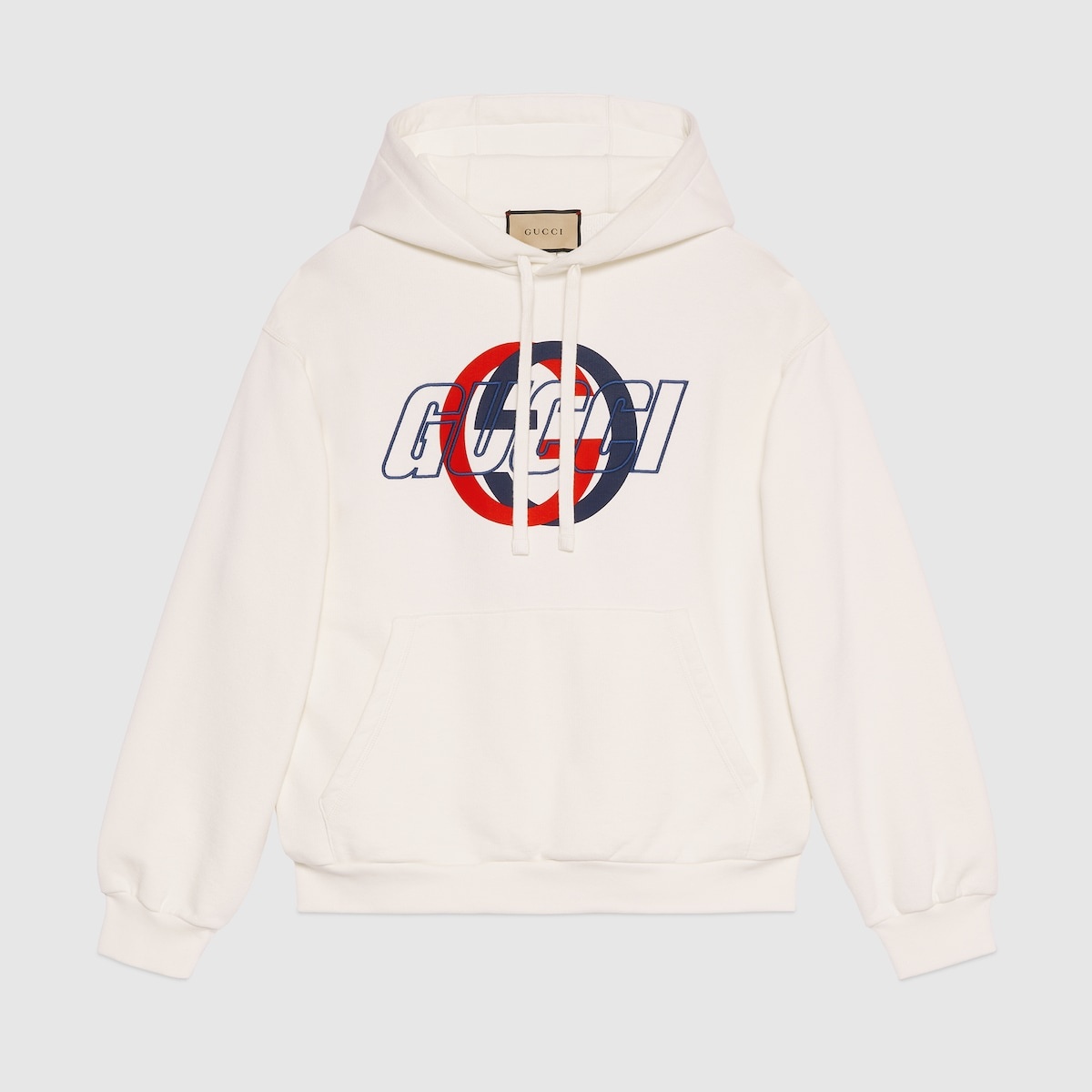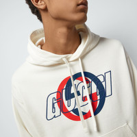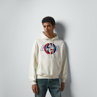 Colors and textures associated with the colder season inspire a new metropolitan wardrobe for Gucci's Cruise 2024 Collection. Crafted from an off white light felted cotton jersey, this hooded sweatshirt reveals a central Gucci embroidery and Interlocking G print in the colors of the House Web. - Off white light felted cotton jersey - Gucci embroidery - Interlocking G print - Fixed hood with drawstring - Dropped shoulder - Long sleeves - Kangaroo pocket - Rib trim - Made in Italy - The product shown in this image is a size small