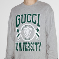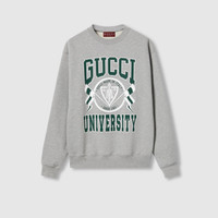 Creative Director Sabato De Sarno reinvents the essential men's wardrobe for the Fall Winter 2024 collection, with a new and contemporary perspective. The everyday cotton jersey sweatshirt is revived with a Gucci University print for a nonchalant feel. - Grey heavy felted cotton jersey - Gucci University print - Crewneck - Dropped shoulder - Rib trim - Shoulder drop: 21"; based on a size S - Chest: 23"; based on a size S - Sleeves length: 25"; based on a size S - Regular fit - Length: 28.3"; based on a size S - Made in Italy - The product shown in this image is a size small