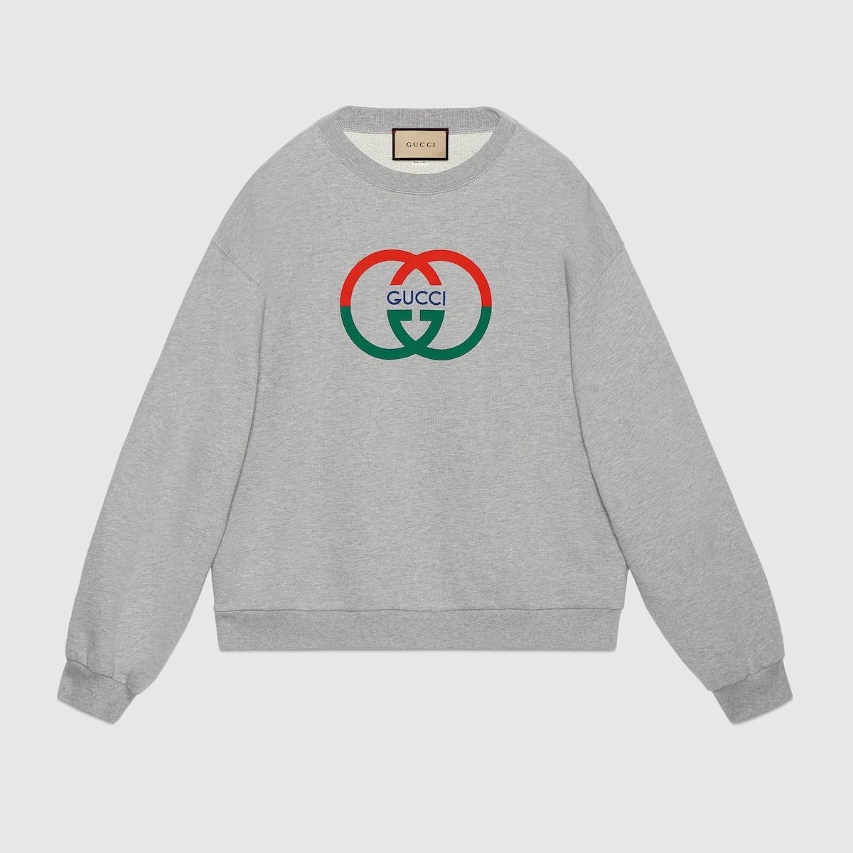 Welcoming warmer days, the men's Cruise 2024 collection presents sportier pieces with vibrant prints. The Web continues to lend an archival touch, while logo details take on bold modernity. This soft cotton jersey sweatshirt is enriched with a contrasting Gucci Interlocking G print, making a bold style statement in the Web colors. - Grey lightweight felted cotton jersey - Gucci Interlocking G print - Crewneck - Dropped shoulder - Rib trim - Made in Italy - The product shown in this image is a size small