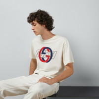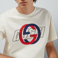 Welcoming warmer days, the men's Cruise 2024 collection presents sportier pieces with vibrant prints. The Web continues to lend an archival touch, while logo details take on bold modernity. This off white medium cotton jersey T-shirt is enriched with a contrasting Gucci and Interlocking G print, making a bold style statement. - Off white medium cotton jersey - Gucci and Interlocking G print - Crewneck - Short sleeves - Rib trim - Made in Italy - The product shown in this image is a size small