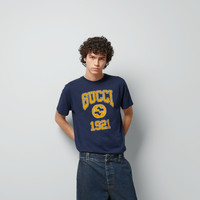 Welcoming warmer days, the men's Cruise 2024 collection presents sportier pieces with vibrant prints. The Web continues to lend an archival touch, while logo details take on bold modernity. This blue cotton jersey T-shirt is enriched with a Gucci, Interlocking G and 1921 print, making a bold style statement. - Blue medium cotton jersey - Gucci, Interlocking G and 1921 print - Crewneck - Short sleeves - Rib trim - Made in Italy - The product shown in this image is a size small