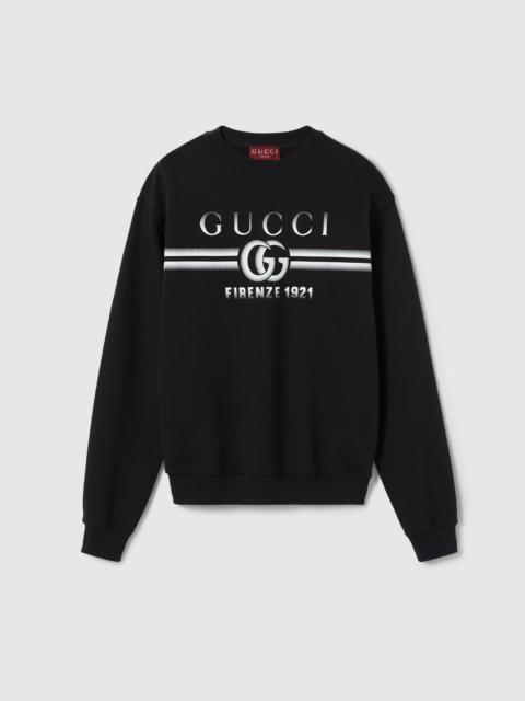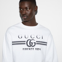 Inspired by the summer spirit and beach clubs on the Italian coast, this item is part of Gucci Lido. Emblematic codes of the House and refined patterns are reinterpreted in contemporary ways for the Pre-Fall collection. This relaxed sweatshirt is presented in a cotton jersey and defined by a central Gucci Double G Firenze 1921 faded print. - White felted cotton jersey - Gucci Double G Firenze 1921 faded print - Crewneck - Dropped shoulder - Rib trim - Regular fit - Sleeve length: 37.4", based on a size S - Made in Italy - The product shown in the image is a size small