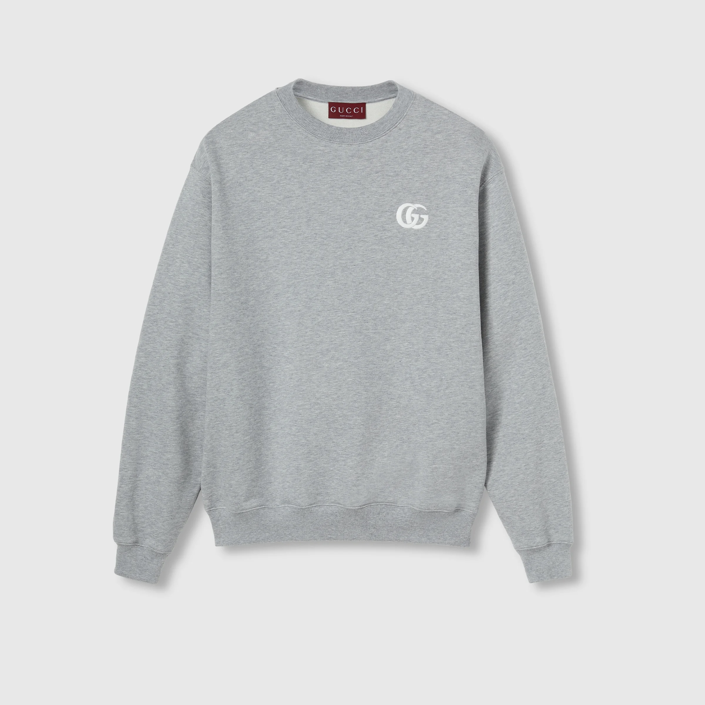Gucci's House codes continue to evolve for the new season across jersey pieces. This regular fit sweatshirt has been crafted from a cotton jersey melange and enriched with a Gucci embroidery. - Grey cotton jersey melange - Double G embroidery - Crewneck - Dropped shoulder - Rib trim - Regular fit - Length: 29.1"; Shoulder: 21.3"; Chest: 23.6"; Sleeves length: 25.4"; based on a size M - Made in Italy - The product shown in this image is a size medium