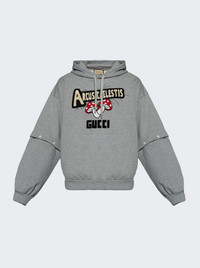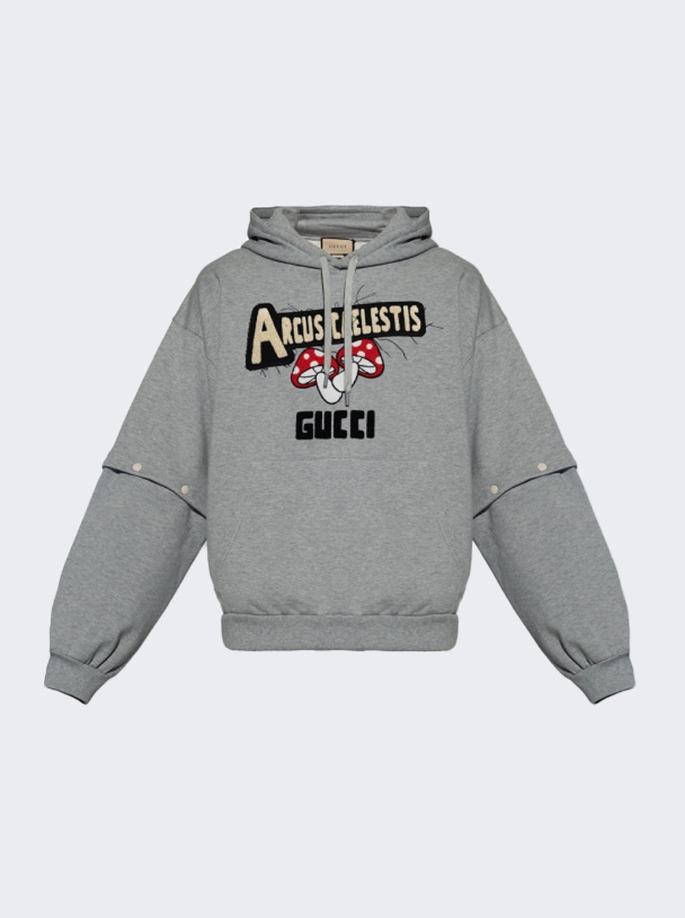 Details - Gray light felted cotton jersey - 'Gucci Arcus Caelestis' and mushroom patch - Fixed hood with drawstring - Detachable sleeves Dimensions: Model is 6'1"/185cm and is wearing a size M Composition: 100% cotton Care: care according to label Brand Style: 752245 XJFWK Designer/Brand: GUCCI