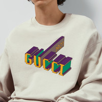 A relaxed attitude speaks volume as casual pieces become indispensable. Sweatshirts, hoodies, and t-shirts with drop shoulders, cropped lengths, and generous fits are adorned with signature embellishments. This sweatshirt is crafted from ivory felted cotton jersey and features the 3D Gucci 1921 print. - Ivory light felted cotton jersey with 3D Gucci 1921 print - Rib trim - Crewneck - Dropped shoulder - Long sleeves - Made in Italy - The product shown in this image is a size small