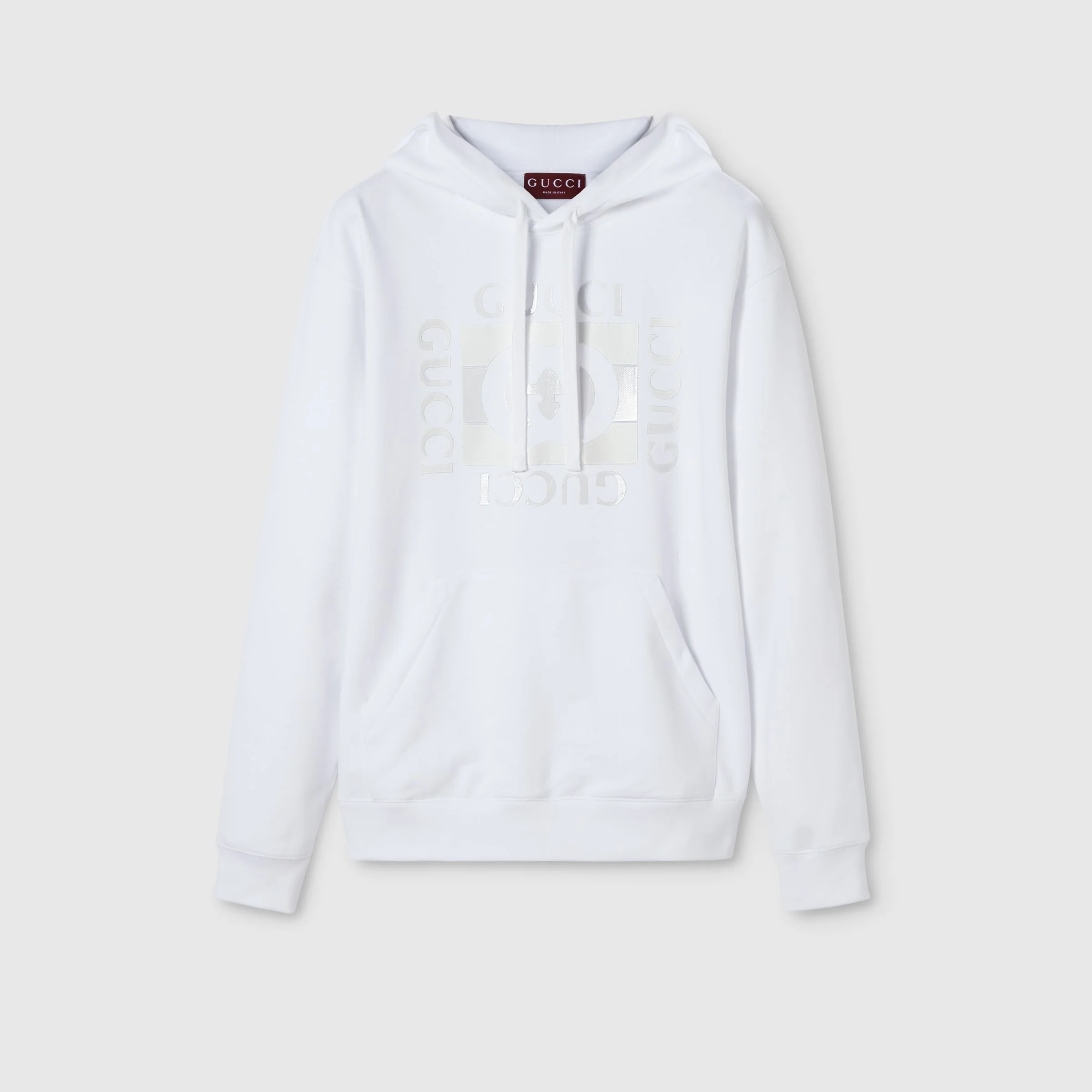 Silhouettes, fabrics, and craftsmanship draw from the House codes and speaks to the present without losing sight of the heritage. This brushed cotton jersey sweatshirt is defined by a Gucci Interlocking G print. - White brushed cotton jersey - Gucci Interlocking G print - Fixed hood with drawstring - Kangaroo pocket - Rib trim - Long sleeves - Length: 26.7" based on a size S