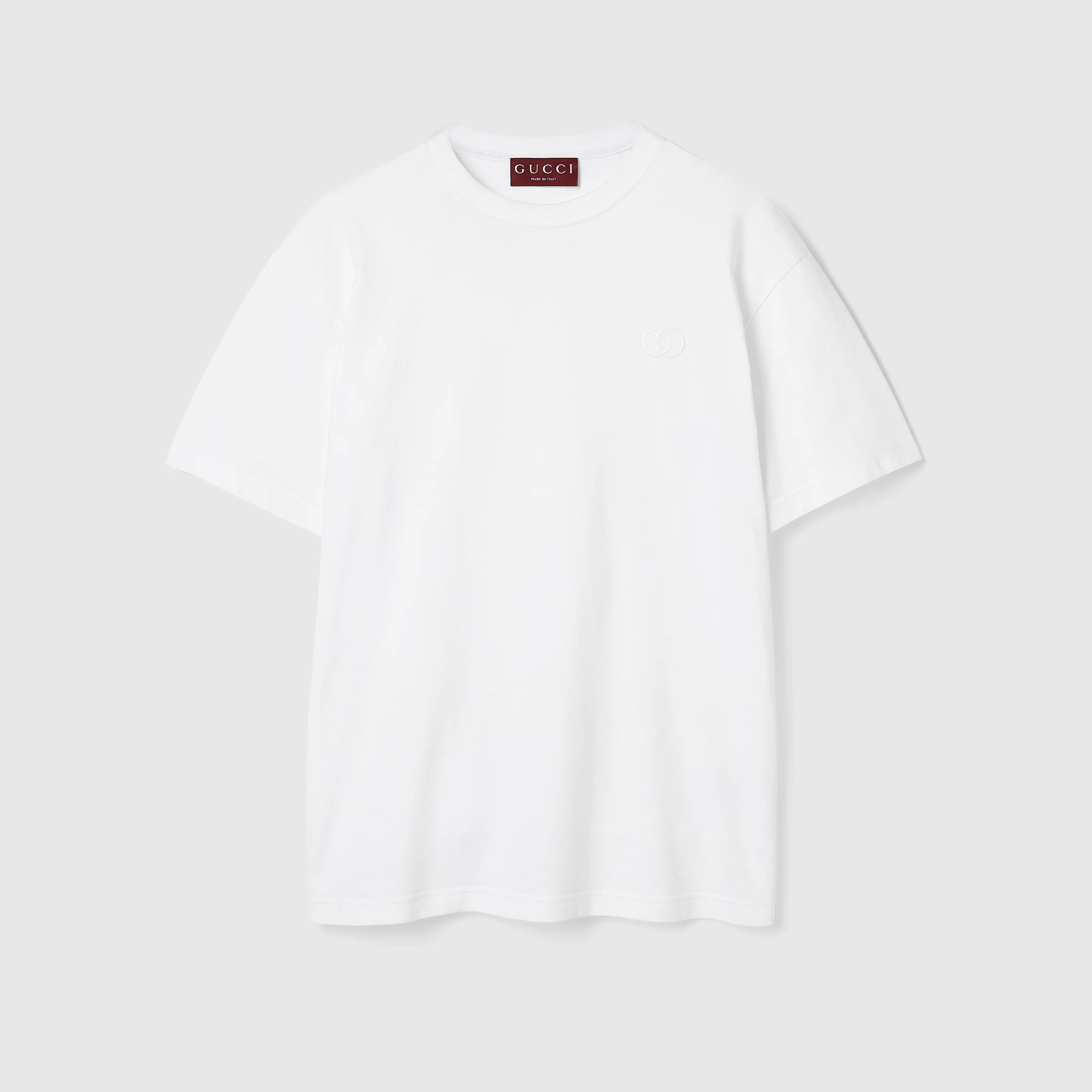 In the Fall Winter 2025 collection, part of the men's Fall Winter 2025 collection, everyday ready-to-wear pieces are elevated thanks to high quality materials and impeccable craftsmanship. This oversize fit T-shirt appears in medium cotton jersey, while a interlocking embroidery enriches the style. - White medium cotton jersey - Interlocking G embroidery - Crewneck - Dropped shoulder - Short sleeves - Rib trim - Regular fit - Total length: 28.9"; Shoulder: 19.7"; Chest: 22"; Sleeves length: 8.5"; (size M) - Made in Italy