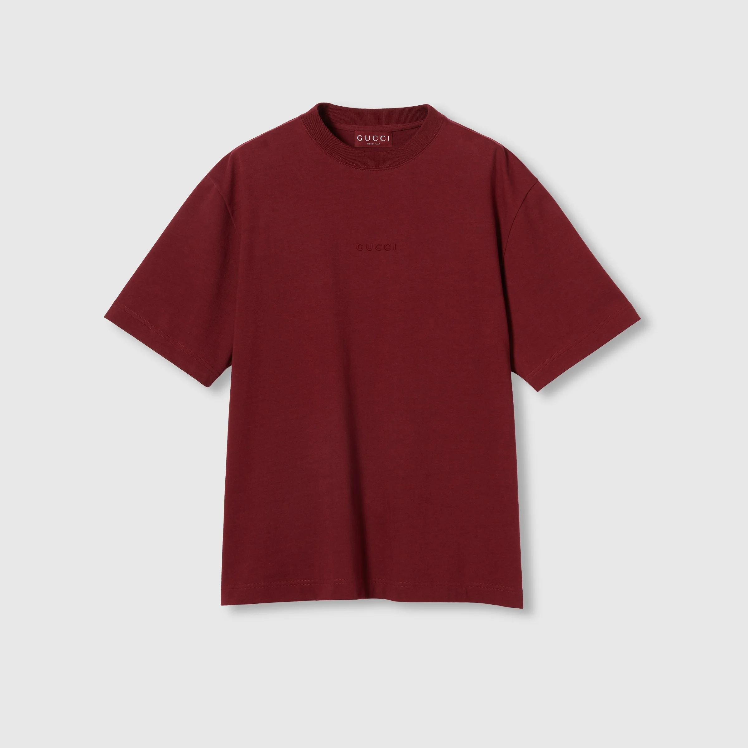 Part of the men's Fall Winter 2024 collection, everyday ready-to-wear pieces are elevated thanks to high quality materials and impeccable craftsmanship. This oversize fit T-shirt appears in a Rosso Ancora red heavy felted cotton jersey, while a Gucci embroidery enriches the chest. - Gucci Rosso Ancora red heavy felted cotton jersey - Gucci embroidery - Crewneck - Dropped shoulder - Short sleeves - Rib trim - Regular fit - Length: 28.9"; Shoulder: 19.7"; Chest: 22"; Sleeves length: 8.5"; based on a size M - Made in Italy - The model is 6'1" and is wearing size small