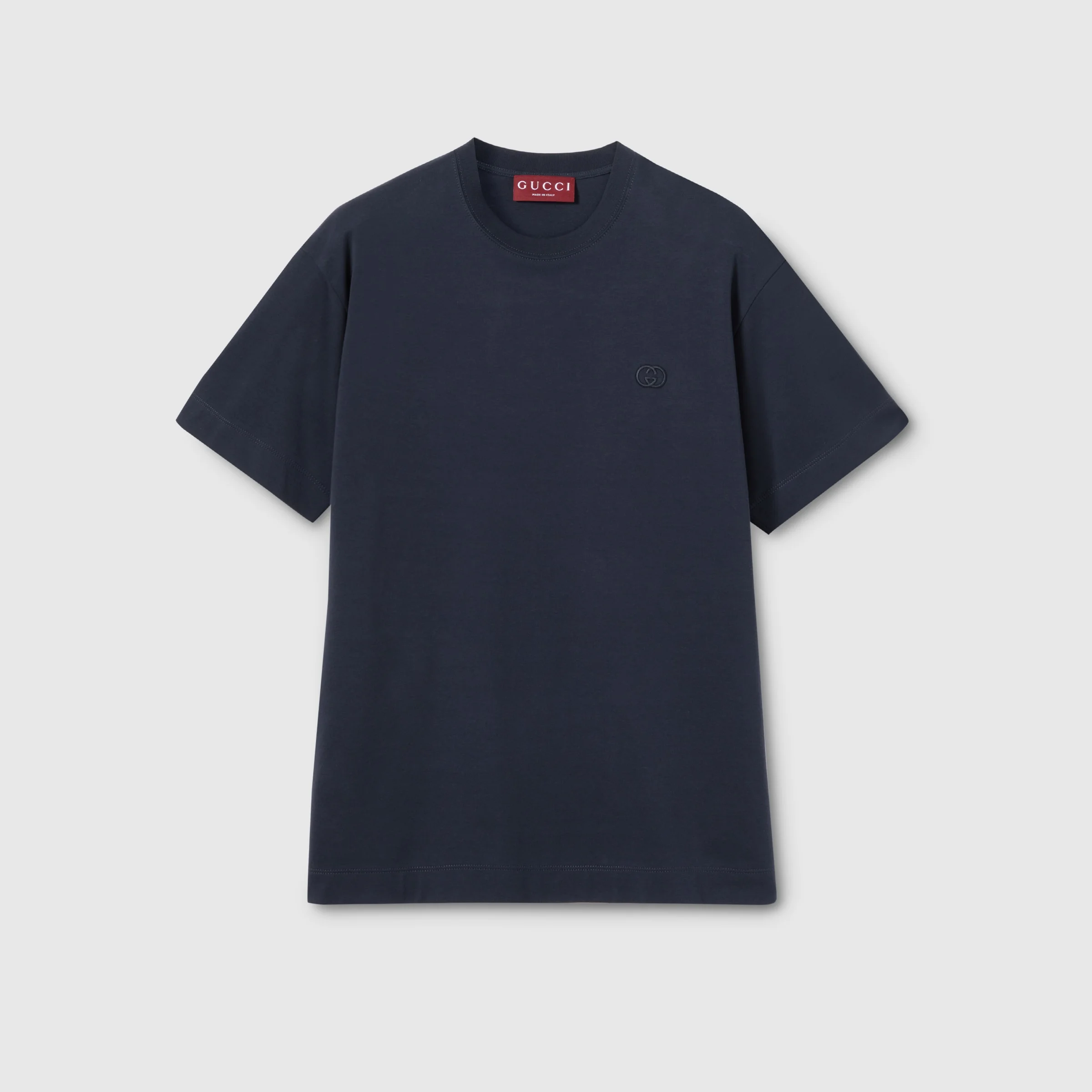Silhouettes, fabrics, and craftsmanship draw from the House codes and speaks to the present without losing sight of the heritage. This soft cotton jersey T-shirt is complete with an Interlocking G embroidery. - Dark blue soft cotton jersey - Interlocking G embroidery - Crewneck - Short sleeves - Length: 28.1"; based on a size S