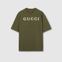 The Cruise 2026 men's collection is a journey through legacy and modernity rooted in Gucci's archives. Crafted from medium cotton jersey, this T-shirt is defined by a Gucci logo embroidery. - Forest green medium cotton jersey - Gucci logo embroidery - Crewneck - Short sleeves - Oversize fit - Length: 29.9"; Shoulder: 21.3"; Chest: 24"; Sleeves length: 11"; based on a size M - Made in Italy - Fabric: 100% Cotton - Embroidery: 100% Polyester