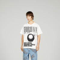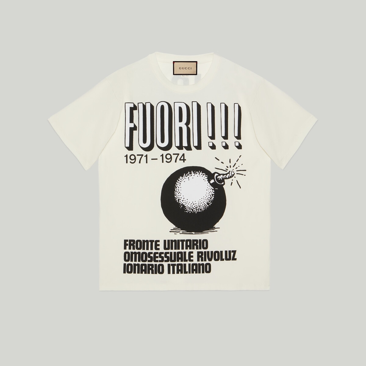 Down the runway, ready-to wear pieces and soft accessories featured the print "FUORI!!!", the name of a book and reprint of a magazine and an association that fought for LGBTQ+ rights throughout the 1970s and 1980s. This T-shirt is presented in off white cotton jersey. - Off white cotton jersey - Fuori!!! Manifest print FUORI!!! 1971-1974, anthology curated by Carlo Antonelli and Francesco Urbano Ragazzi published by Nero Editions. - Gucci print at the back - Crewneck - Short sleeves - Oversize fit - Length: 29.1" based on a size medium - Made in Italy - The product shown in this image is a size medium