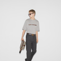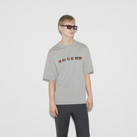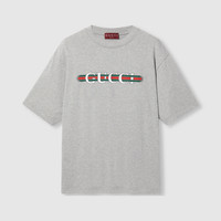 The Web is being re-envisioned as patterns and unique details through complex constructions and stitching techniques that elevate knitwear and more pieces from mere sportswear to iconic masterpieces. This oversized T-shirt is presented in heavy cotton jersey and reveals a Gucci Web print across the chest. - Grey heavy cotton jersey - Gucci Web print - Crewneck - Dropped shoulder - Short sleeves - Shoulder drop: 20.8"; based on a size small - Chest: 23.2"; based on a size small - Sleeves length: 10.6"; based on a size small - Oversize fit - Length: 29.1"; based on a size small - Made in Italy - The product shown in this image is a size small
