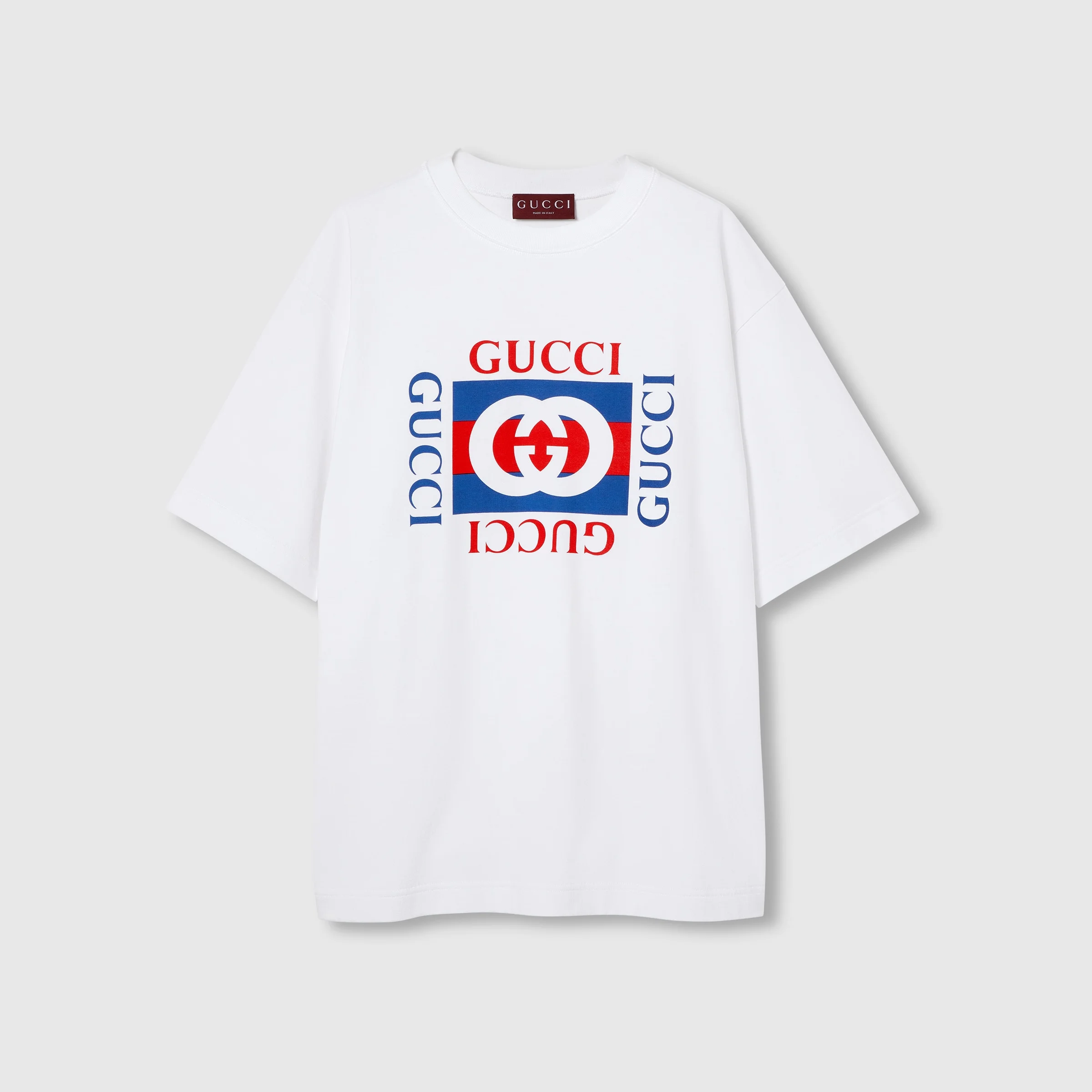 Inspired by the summer spirit and beach clubs on the Italian coast, this item is part of Gucci Lido. Emblematic codes of the House and refined patterns are reinterpreted in contemporary ways for the Pre-Fall collection. Presented in white cotton jersey, this T-shirt is defined by a Gucci Interlocking G print. - White heavy cotton jersey - Gucci Interlocking G print - Crewneck - Dropped shoulder - Short sleeves - Oversize fit - Made in Italy - The product shown in the image is a size small