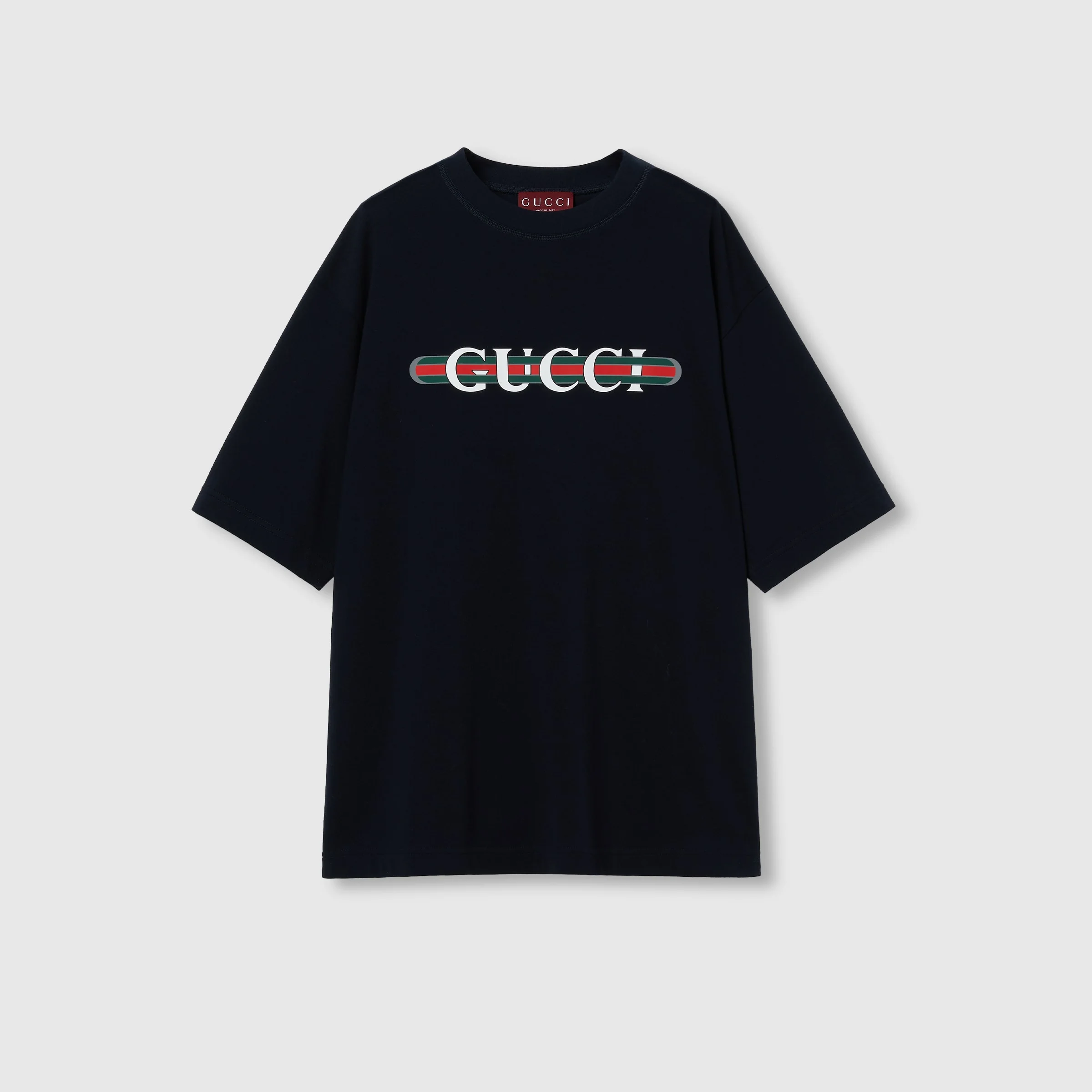 Gucci's House codes continue to evolve for the new season across jersey pieces. This oversized T-shirt is stated in cotton jersey and reveals a Gucci Web print across the chest. - Dark blue heavy cotton jersey - Gucci Web print - Crewneck - Dropped shoulder - Short sleeves - Oversize fit - Length: 29.9"; Shoulder: 21.3"; Chest: 24"; Sleeves length: 11"; based on a size M - Made in Italy - The product shown in this image is a size medium