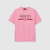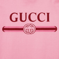 Everyday pieces are elevated with the Gucci selvedge or Gucci vintage logo print for an urban feel. Crafted from pink cotton jersey, this T-shirt is defined by a Gucci logo with Web and Interlocking G print. - Pink cotton jersey - Gucci logo with Web Interlocking G print - Crewneck - Dropped shoulder - Short sleeves - Rib trim - Regular fit - Length: 28.9"; Shoulder: 19.7"; Chest: 22"; Sleeves length: 8.5"; based on a size M - Made in Italy