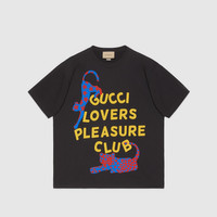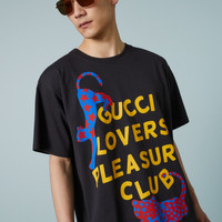 A key theme in the Gucci narrative, a humorous spirit permeates signature designs, adding a whimsical feel to the Pre-Fall 2023 collection. The House plays with vibrant prints in innovative ways, enriching a selection of menswear looks. Here, this cotton jersey t-shirt is presented in black and defined by a 'Gucci Lovers Pleasure Club' and cat print. - Black cotton jersey - 'Gucci Lovers Pleasure Club' and cat print - Crewneck - Short sleeves - Oversize fit - Length: 29.1" based on a size medium - Made in Italy - The product shown in this image is a size medium