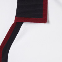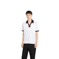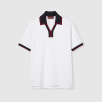 The Pre-Fall 2025 collection spotlights essential silhouettes with emblematic details from daywear to eveningwear. This polo T-shirt is made from cotton piquet and decorated with an embossed Gucci logo. - White cotton piquet - Navy and burgundy stripe trim - Embossed Gucci logo - Polo collar - Chest pocket - Short sleeves - Made in Italy