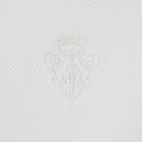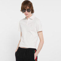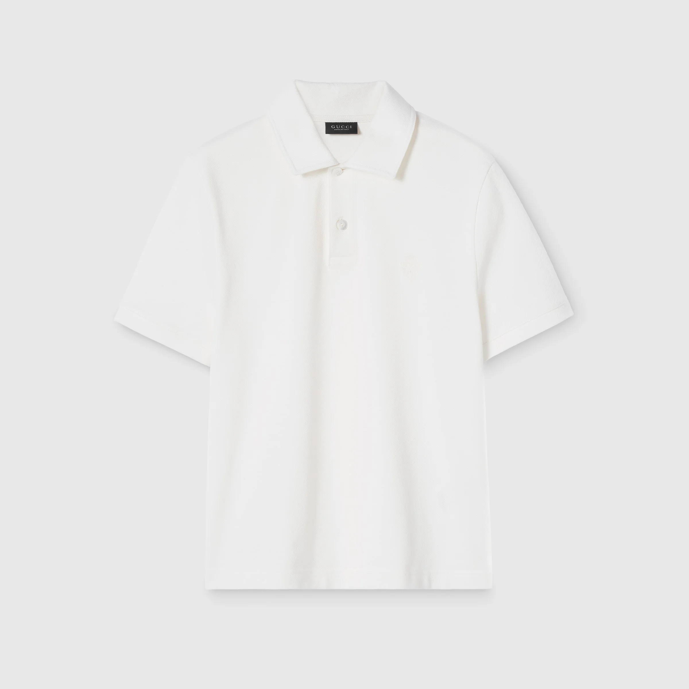 Introducing Spring Summer 2026. This style is inspired by the "Bastardo" look of La Famiglia. The collection reinterprets the House’s codes through singular personalities and distinctive aesthetic attitudes. Crafted from stretch cotton piquet, this polo shirt is enriched with a Gucci crest embroidery. - White stretch cotton piquet - Gucci crest embroidery - Polo collar - Short sleeves - Front button closure - Length: 22.8", based on a size XS - Made in Italy - Fabric: 97% Cotton, 3% Elastane - Embroidery: 100% Polyester