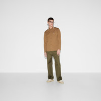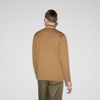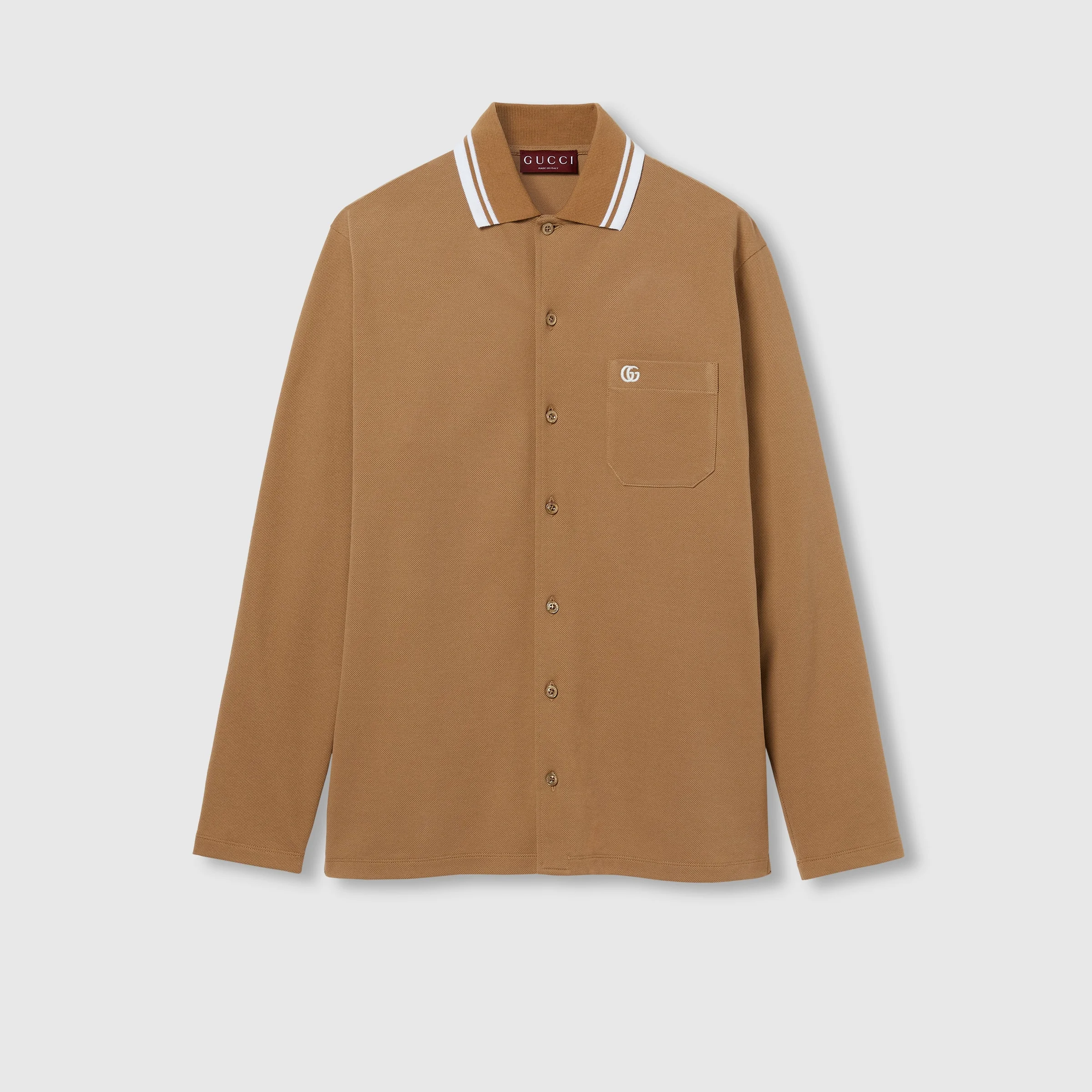 Classics such as soft knitwear and polo shirts throughout the Cruise 2025 collection stand out with subtle details that elevate everyday looks. This regular fit polo shirt is presented in a stretch cotton piquet and enriched with a contrasting Double G embroidery. - Camel stretch cotton piquet - Double G embroidery - Striped polo collar - Dropped shoulder - Long sleeves - Chest pocket - Split hem - Button closure - Regular fit - Length: 29.5"; Shoulder: 18.7"; Chest: 22.4"; Sleeves length: 25.4"; based on a size M - Made in Italy - The product shown in this image is a size small