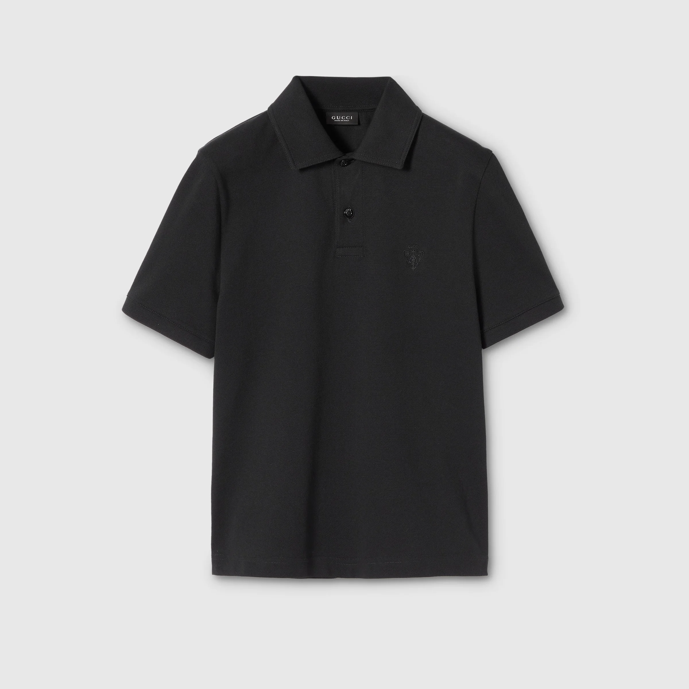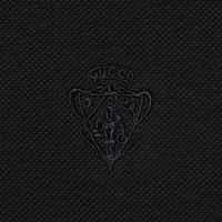 Introducing Spring Summer 2026. This style is inspired by the "Bastardo" look of La Famiglia. The collection reinterprets the House’s codes through singular personalities and distinctive aesthetic attitudes. Crafted from stretch cotton piquet, this polo shirt is enriched with a Gucci crest embroidery. - Black stretch cotton piquet - Gucci crest embroidery - Polo collar - Short sleeves - Front button closure - Length: 22.8", based on a size XS - Made in Italy - Fabric: 97% Cotton, 3% Elastane - Embroidery: 100% Polyester