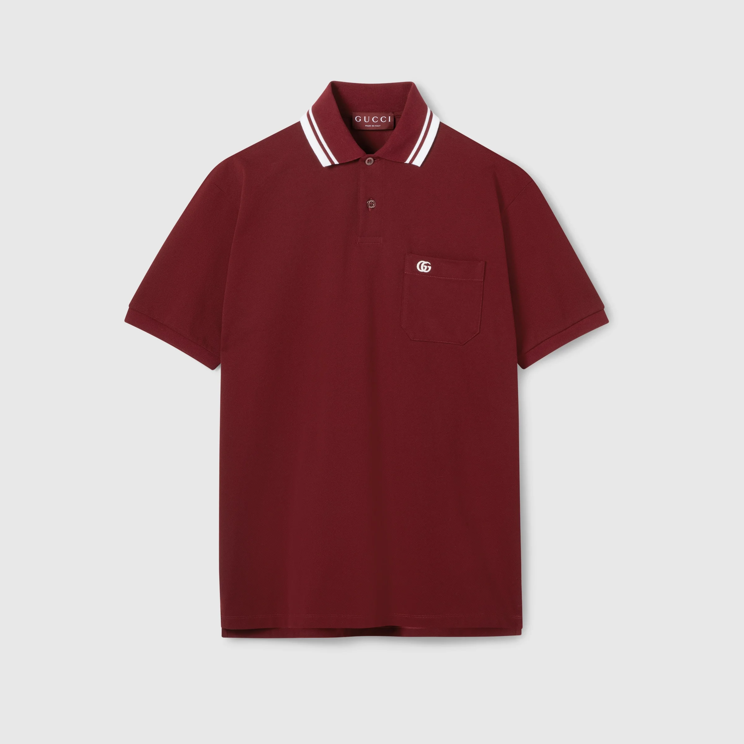 Fall shades define a selection of ready-to-wear pieces paired with heritage details of the House. This regular fit polo shirt is presented in Gucci Rosso Ancora red cotton piquet and is defined by a Double G embroidery. - Gucci Rosso Ancora red stretch cotton piquet - Double G embroidery - Striped trim on collar - Polo collar - Dropped shoulder - Short sleeves - Chest pocket - Rib trim - Button closure - Regular fit - Length: 29.5"; Shoulder: 18.7"; Chest: 22.4"; Sleeves length: 9.4"; based on a size M - Made in Italy