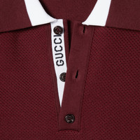 The Pre-Fall 2025 collection spotlights essential silhouettes with emblematic details from daywear to eveningwear. This polo T-shirt is made from cotton piquet knit and reveals a contrasting Gucci intarsia along the button line. - Gucci Rosso Ancora red cotton piquet knit - Gucci intarsia - Polo collar - Short sleeves - Rib trim - Shoulder drop: 16.9"; based on a size S - Chest: 19.8"; based on a size S - Sleeves length: 9.4"; based on a size S - Button closure - Length: 25.5"; based on a size S - Made in Italy