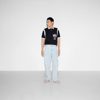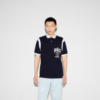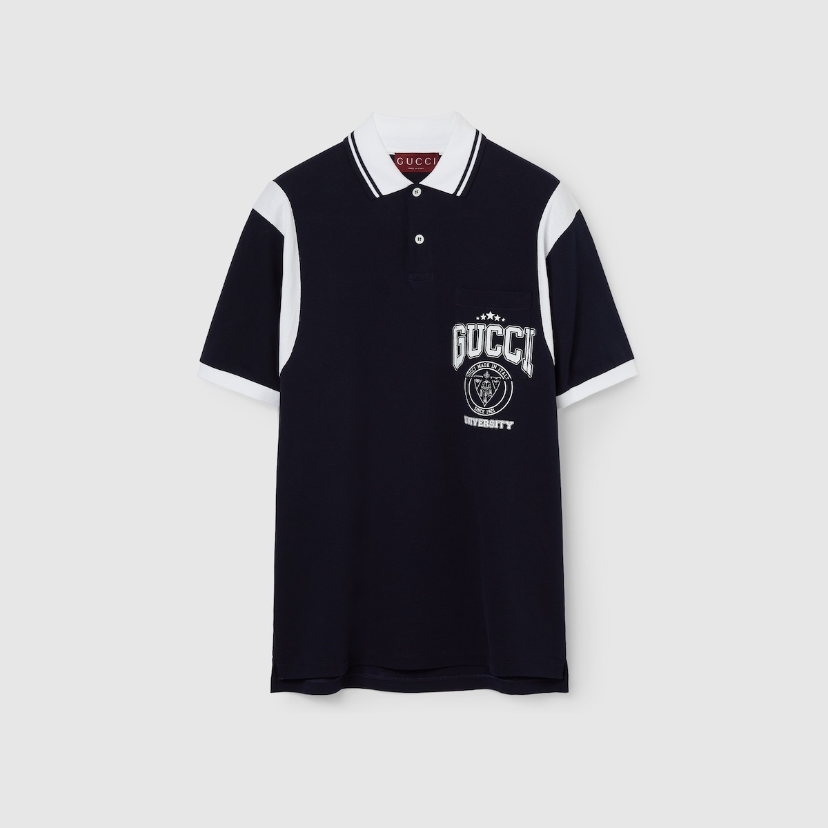 Gucci's House codes continue to evolve for the new season across jersey pieces. This polo shirt is stated in stretch cotton piquet and defined by a Gucci University print. - Navy stretch cotton piquet - White trim - Gucci University logo print - Polo collar - Contrasting inserts - Short sleeves - Chest pocket - Rib trim - Button closure - Length: 29.5"; Shoulder: 19.7"; Chest: 22"; Sleeves length: 8.5"; based on a size M - Made in Italy - The product shown in this image is a size small