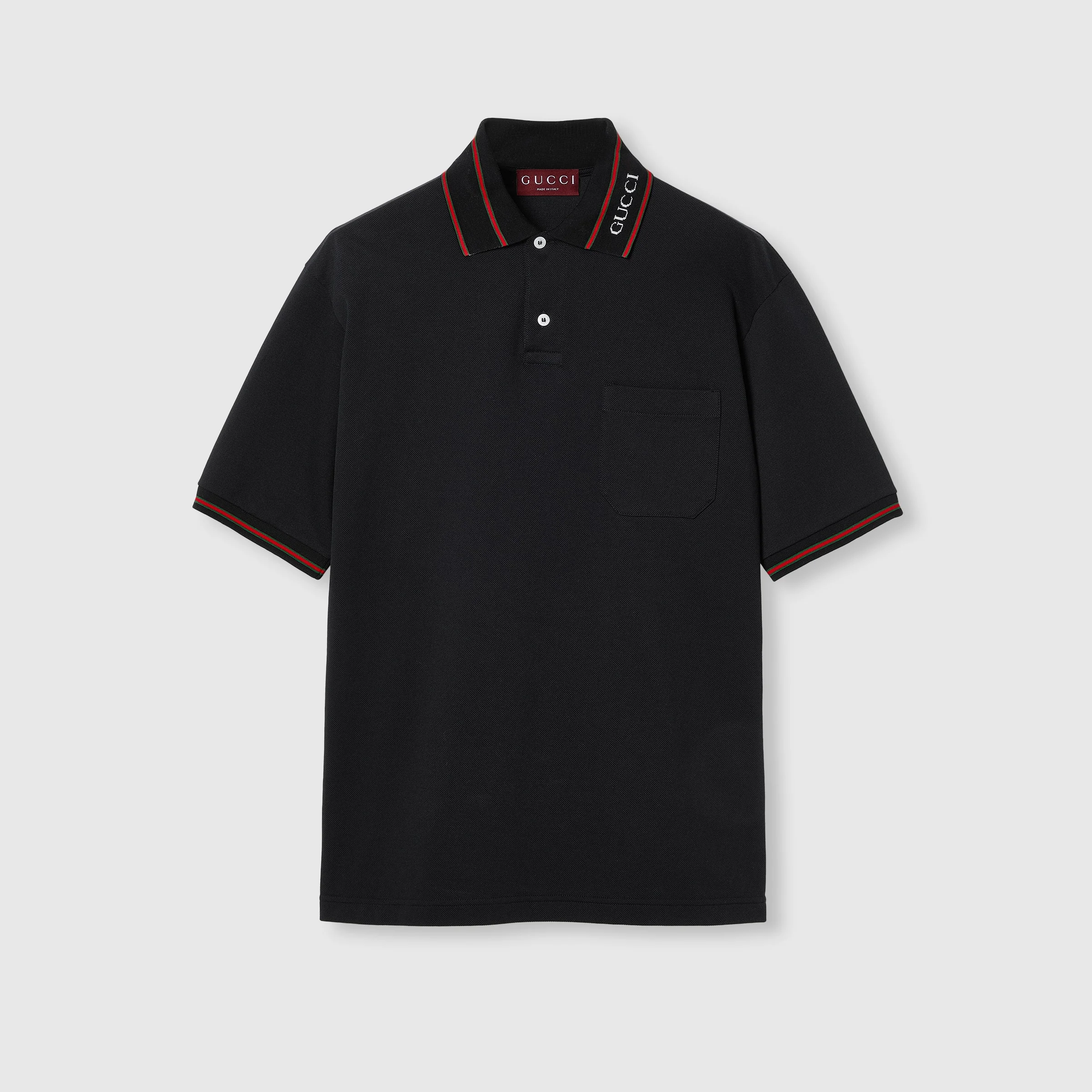 Inspired by the summer spirit and beach clubs on the Italian coast, this item is part of Gucci Lido. Inspired by the summer spirit and beach clubs on the Italian coast, this item is part of Gucci Lido. Across a black base, the Web is being re-envisioned as unique details through special constructions and stitching techniques that elevate this stretch cotton piquet polo shirt. - Black stretch cotton piquet - Gucci jacquard detail - Green and red Web stripe detail - Striped polo collar - Dropped shoulder - Short sleeves - Chest pocket - Button closure - Regular fit - Made in Italy - The product shown in the image is a size small