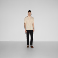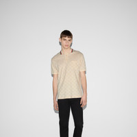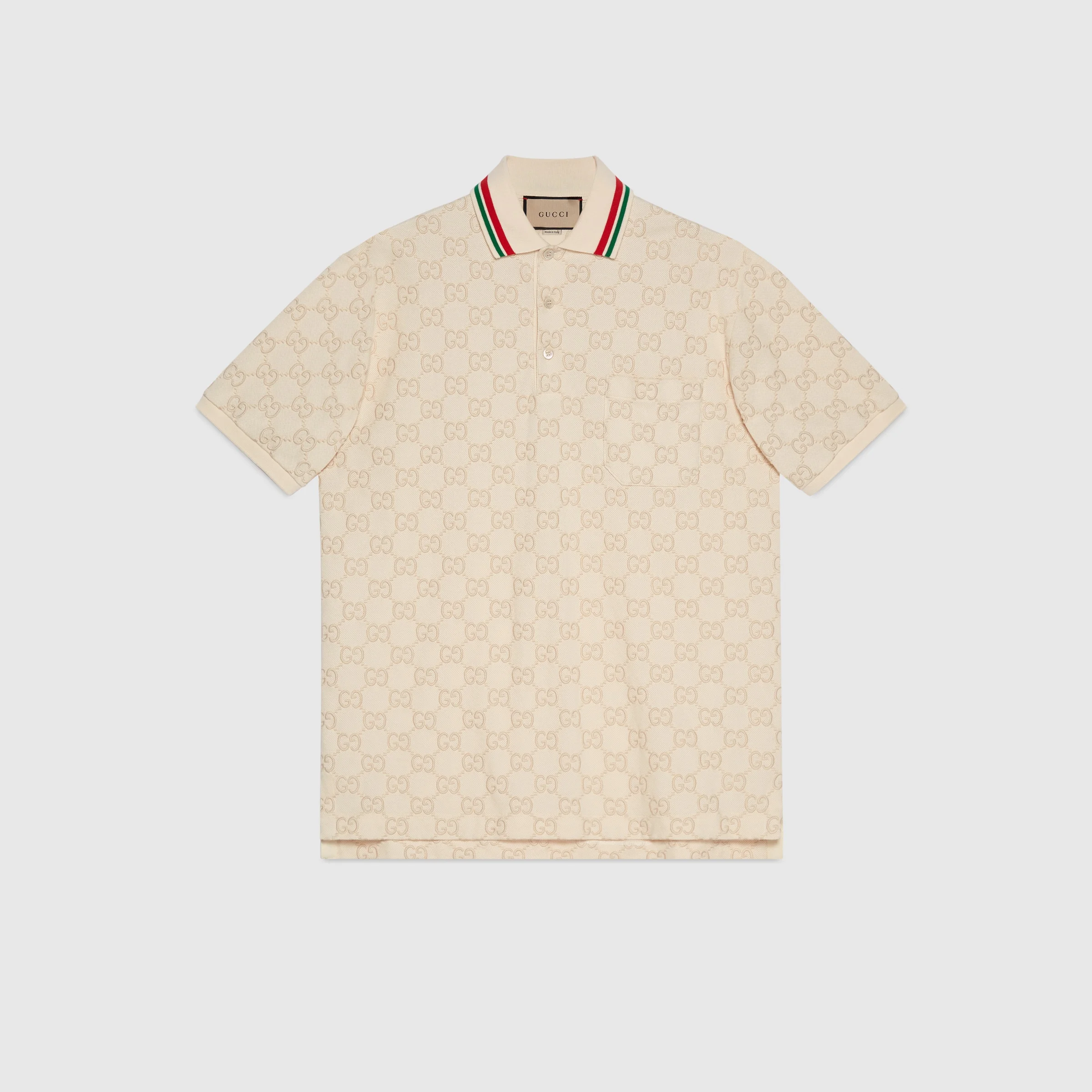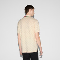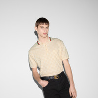An allover GG embroidery defines this ivory polo bringing a surprising and refined twist to its stretch cotton piquet construction. The style is accentuated by a chest patch pocket and a polo collar with stripes. - Ivory stretch cotton piquet - GG embroidery - Striped polo collar - Short sleeves - Chest patch pocket - Side vents - Back length: 29,5"; based on size M - Regular fit - Made in Italy - The model is 6'1" and is wearing size medium - Shoulder width: 18,7"; based on a size M