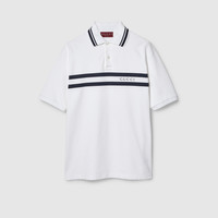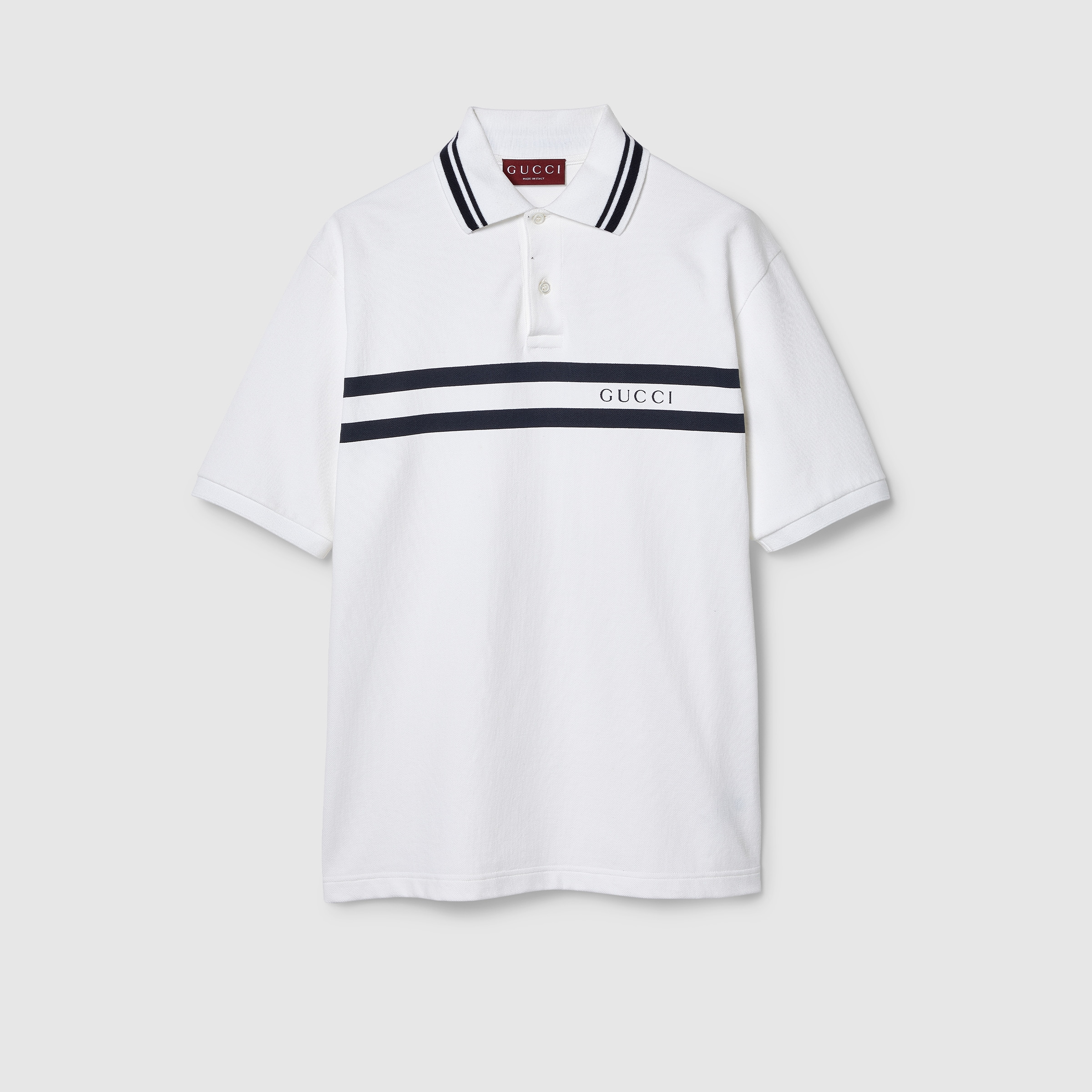 The Pre-Fall selections spotlight essential silhouettes with emblematic details from daywear to eveningwear. This relaxed polo shirt is made from stretch cotton piquet and reveals a striped Gucci logo print across themiddle. - White stretch cotton piquet - Striped Gucci logo print - Striped polo collar - Short sleeves - Button closure - Made in Italy - The product shown in the image is a size small