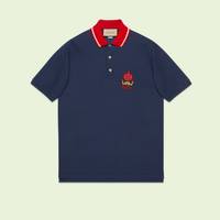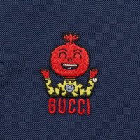 Artwork by Chile-based cartoonist and illustrator, Pablo Delcielo, adds joy and playfulness to Gucci Love Parade. Animated mythical creatures and fun fruit characters decorate ready-to-wear pieces and accessories in the form of vibrant patches and prints. This stretch cotton piquet polo shirt has the Gucci onion embroidered patch on the front. - Dark blue stretch cotton piquet - Gucci onion embroidered patch - Artwork by Pablo Delcielo - Striped polo collar - Short sleeves - Button placket - Made in Italy