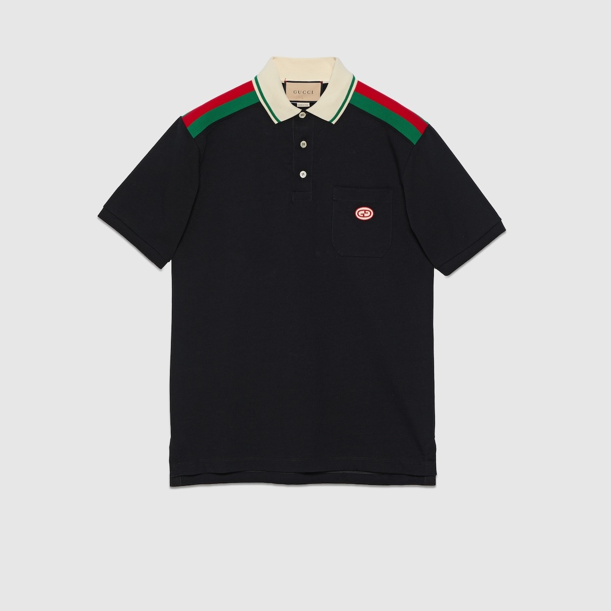 The men's Cruise 2024 collection presents a contemporary silhouette. Voluminous trousers are paired with fitted jackets, while relaxed cargo pants worn with outerwear pieces offer a sporty edge. Presented in black heavy cotton jersey, this sleek polo shirt is defined by a green and red Web stripe and a retro GG embroidered patch. - Black heavy cotton jersey - Green and red Web - Retro GG embroidered patch - Contrasting polo collar - Short sleeves - Chest pocket - Rib trim - Back length: 29,5"; based on size M - Button closure - Regular fit - Made in Italy - The product shown in this image is a size small - Shoulder width: 18,7"; based on a size M
