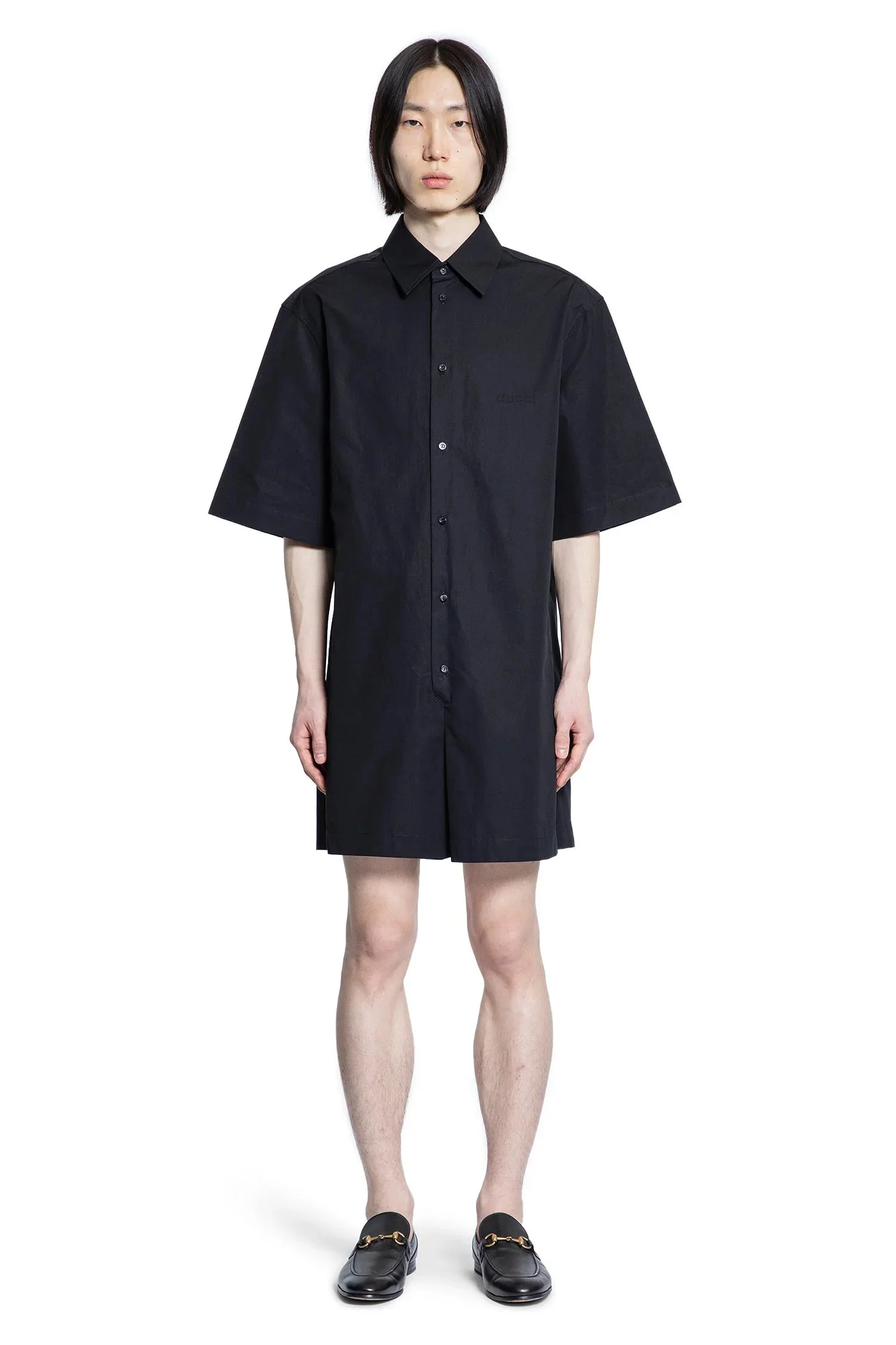 DESCRIPTION - Black - Cotton poplin - Classic collar - Button closure - Dropped shoulders - Short sleeves - Back locker loop DETAILS - Made in: Italy - Composition: 100% Cotton - Model code: 809821Z7AMO 1000 - Item ID: 9493305098582 SIZE & FIT Model wears size 48 Model Height 189 cm Chest 84 cm Waist 70 cm Hips 92 cm