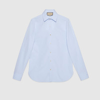 A concept continuously explored by the Creative Director, tailor-inspired pieces combine sartorial excellence and an eclectic vision. This cotton poplin shirt has a tonal Double G embroidery that gives a subtle nod to the House. - Light blue cotton poplin - Double G embroidery - Long sleeves - Point collar - Button-through cuffs - Mother of pearl buttons - Made in Italy - The model is 6'1" tall. The product shown in this image is a size 15++