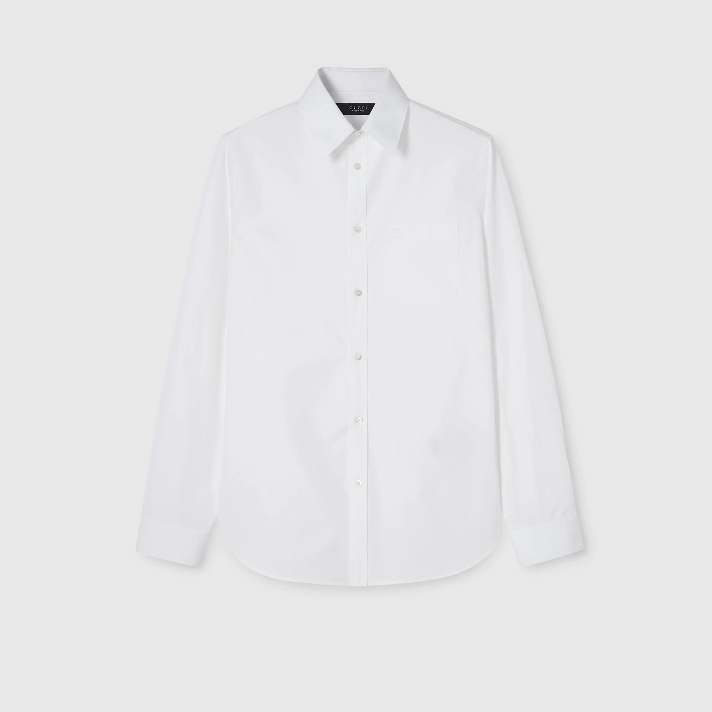 Introducing Spring Summer 2026. This style is inspired by the "Ragazzo della Porta Accanto" look of La Famiglia. The collection reinterprets the House’s codes through singular personalities and distinctive aesthetic attitudes. Crafted from piece dyed cotton poplin, this shirt is enriched with an Interlocking G embroidery. - White piece dyed cotton poplin - Interlocking G embroidery - Point collar - Chest pocket - Long sleeves - Front button closure - Length: 29.9"; Sleeves length: 34.2", based on a size 15 - Made in Italy - Fabric: 100% Cotton - Embroidery: 100% Polyester