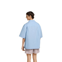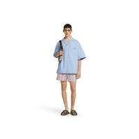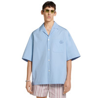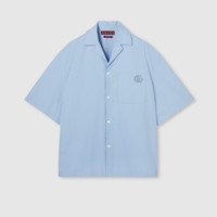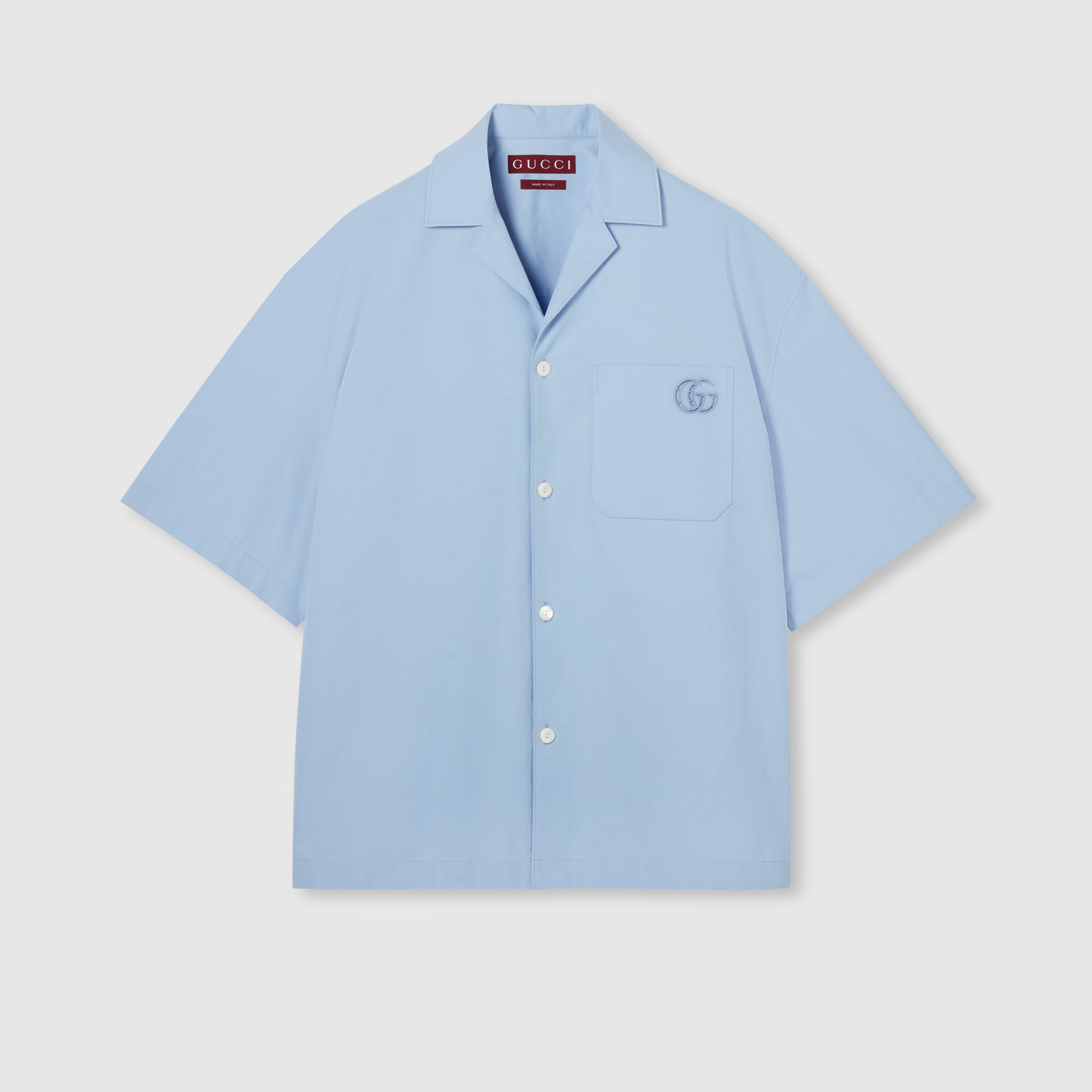Maritime-inspired designs enrich casual silhouettes perfect for the seaside, featuring stripes, anchor motifs and the House logo in the Pre-Fall 2025 collection. This light blue heavy cotton poplin shirt reveals a Double G ajour embroidery. - Light blue heavy cotton poplin - Double G ajour embroidery - Open collar - Dropped shoulder - Short sleeves - Side slits - Button closure - Length: 30.7"; Shoulder: 23.6"; Chest: 55.1"; Sleeves length: 23.2"; based on a size 48 IT - Made in Italy