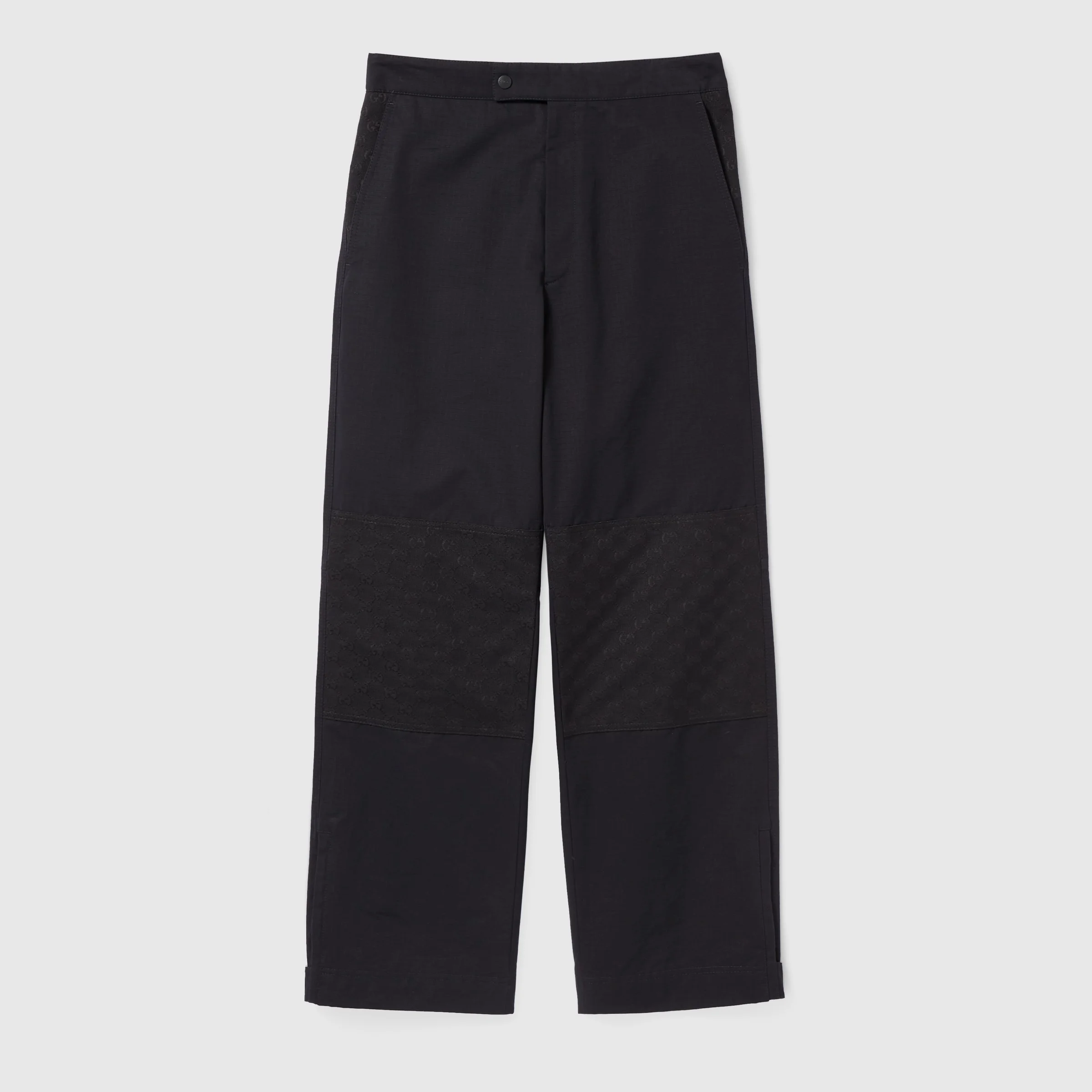 Soft, textured materials define a selection of winter wardrobe pieces, for city or alpine strolls. Crafted from black cotton ripstop, this pair of pants is enriched with GG canvas inserts. - Black cotton ripstop - Gucci metal lettering - GG canvas insert - Elastic waistband with snap buttons - Side pockets - Snap button and zip closure - Made in Italy
