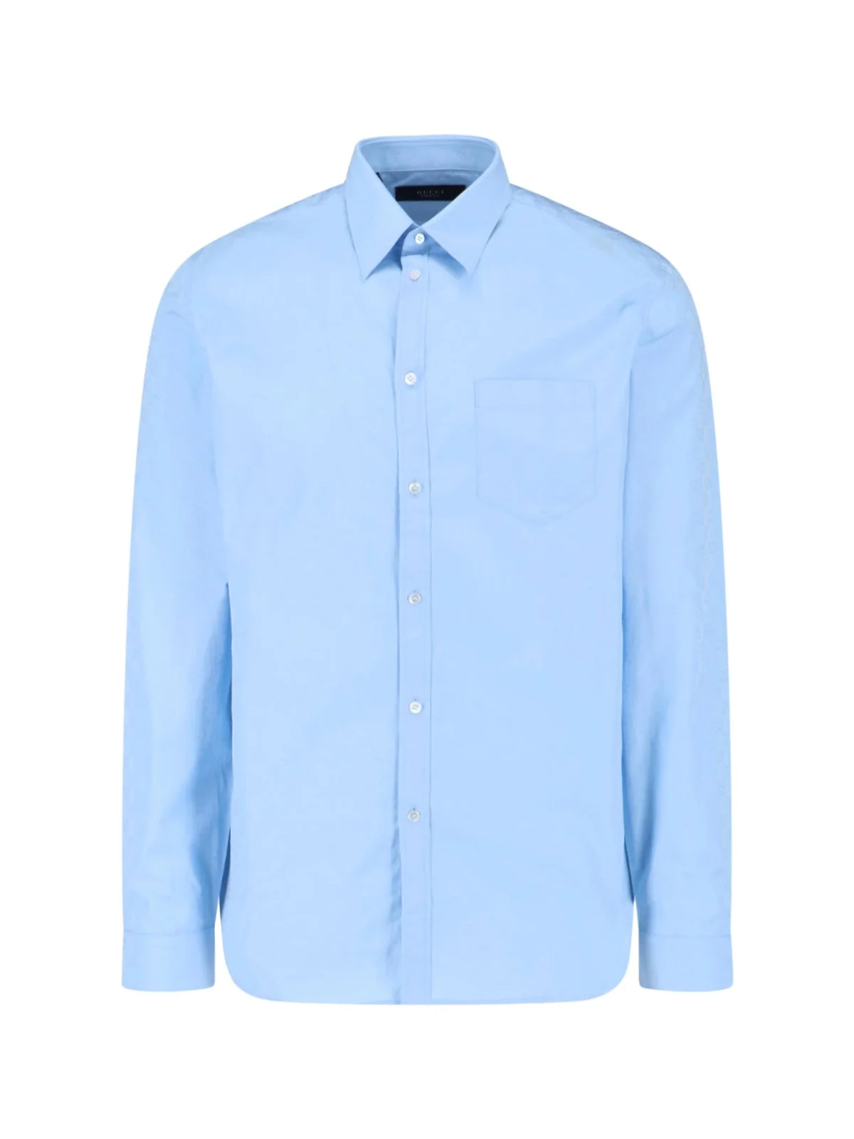 GUCCI LIGHT BLUE COTTON SHIRT WITH COLLAR, LONG SLEEVES, BUTTON CLOSURE. PRODUCT INFO PRODUCT CODE 860785 ZAUO84774 COMPOSITION: 100% COTTON SIZE AND FIT: REGULAR FIT MADE IN: ITALY - BUTTONS: 100% MOTHER OF PEARL