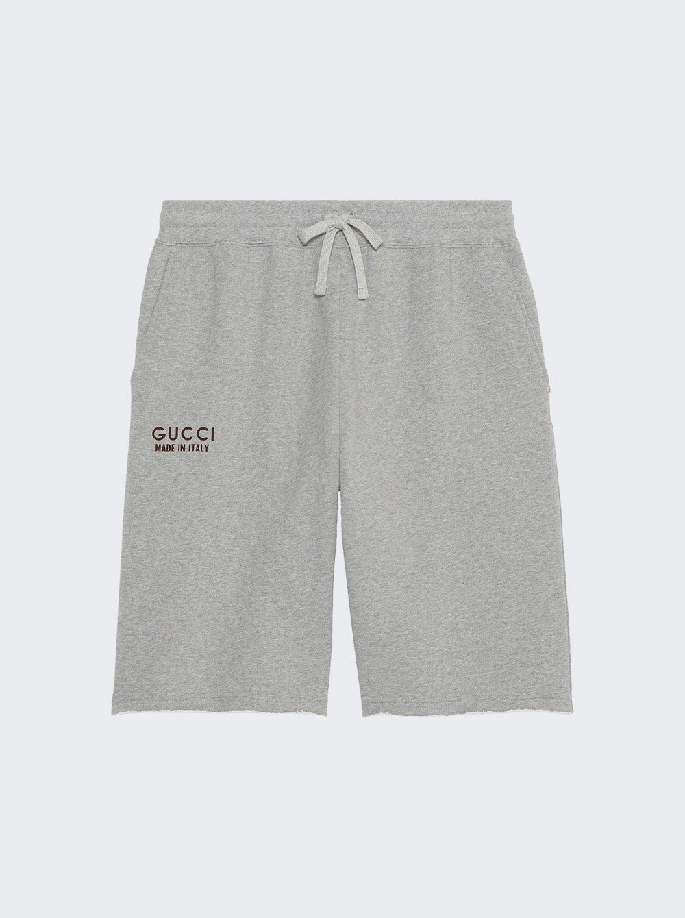 Details - Grey brushed cotton - 'Gucci Made in Italy' flocked print - Elastic waist with drawstring closure - Two front slash pockets - Rear pocket - Raw edge hem - Basket style Dimensions: Model is 6'1"/185cm and is wearing a size M Composition: 100% Cotton Care: Care according to label Brand Style: 768457 XJF3Y Designer/Brand: GUCCI