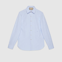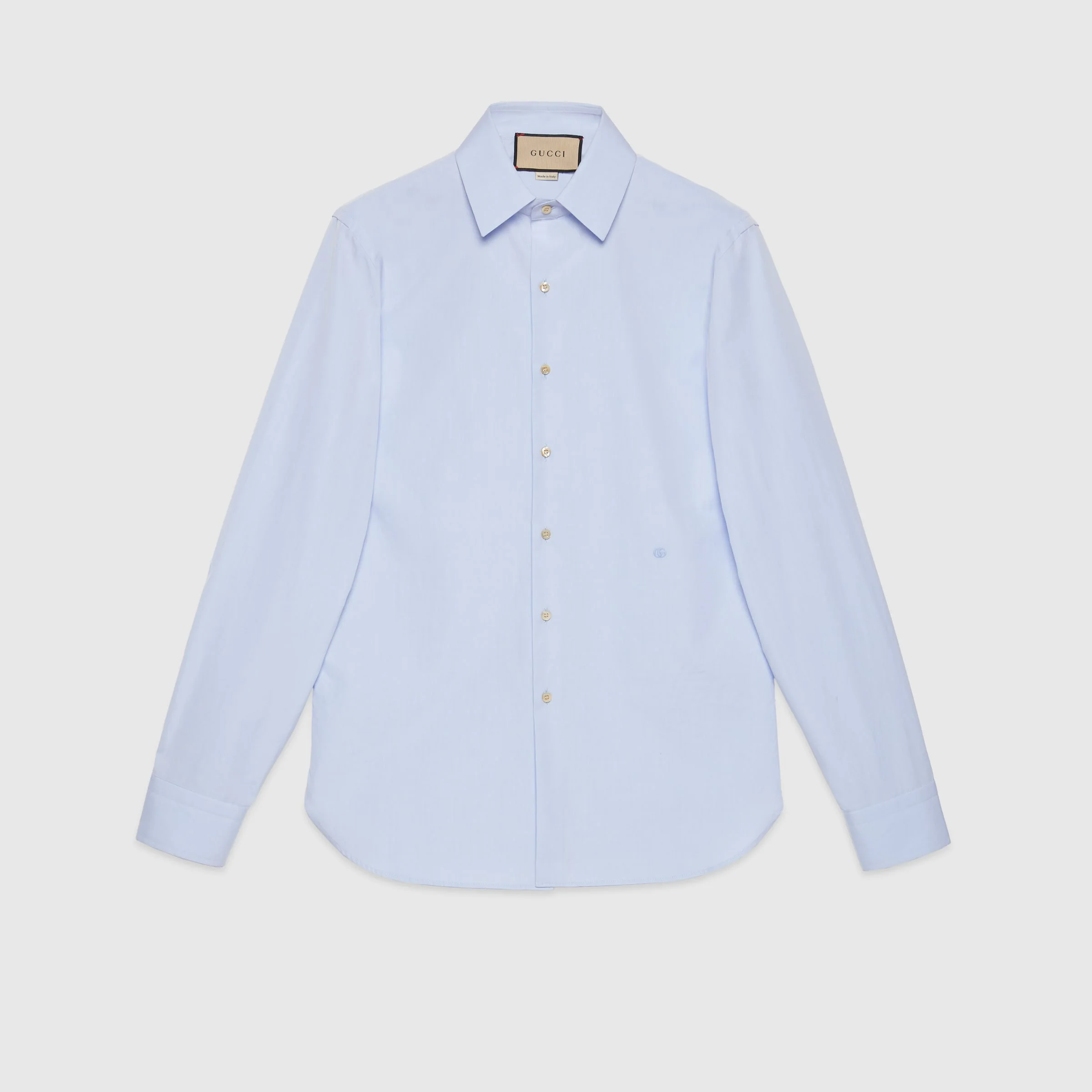 A concept continuously explored by the Creative Director, tailor-inspired pieces combine sartorial excellence and an eclectic vision. This cotton poplin shirt has a tonal Double G embroidery that gives a subtle nod to the House. - Light blue cotton silk poplin - Double G embroidery - Long sleeves - Point collar - Button-through cuffs - Mother of pearl buttons - Made in Italy - The model is 6" tall. The product shown in this image is a size 15++