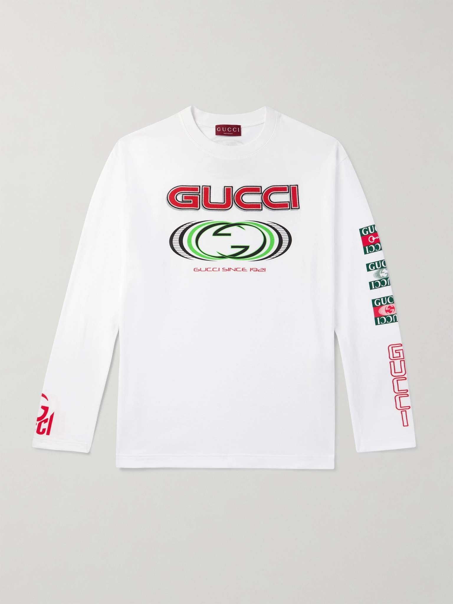 Over a century since Gucci was first founded, the house continues to celebrate its illustrious legacy at every opportunity. This long-sleeved T-shirt has been cut in Italy from soft cotton-jersey and printed with graphic takes on the unmistakable 'GG' logo and its inaugural year. Size & Fit - Model wears a size smaller to achieve a closer fit - Designed for a slightly loose fit - Mid-weight, stretchy fabric - Model is shown wearing a S - Model measures: chest 38"/ 96cm, height 6'1"/ 185cm Details & Care - Multicoloured cotton-jersey - 100% cotton - Machine wash
