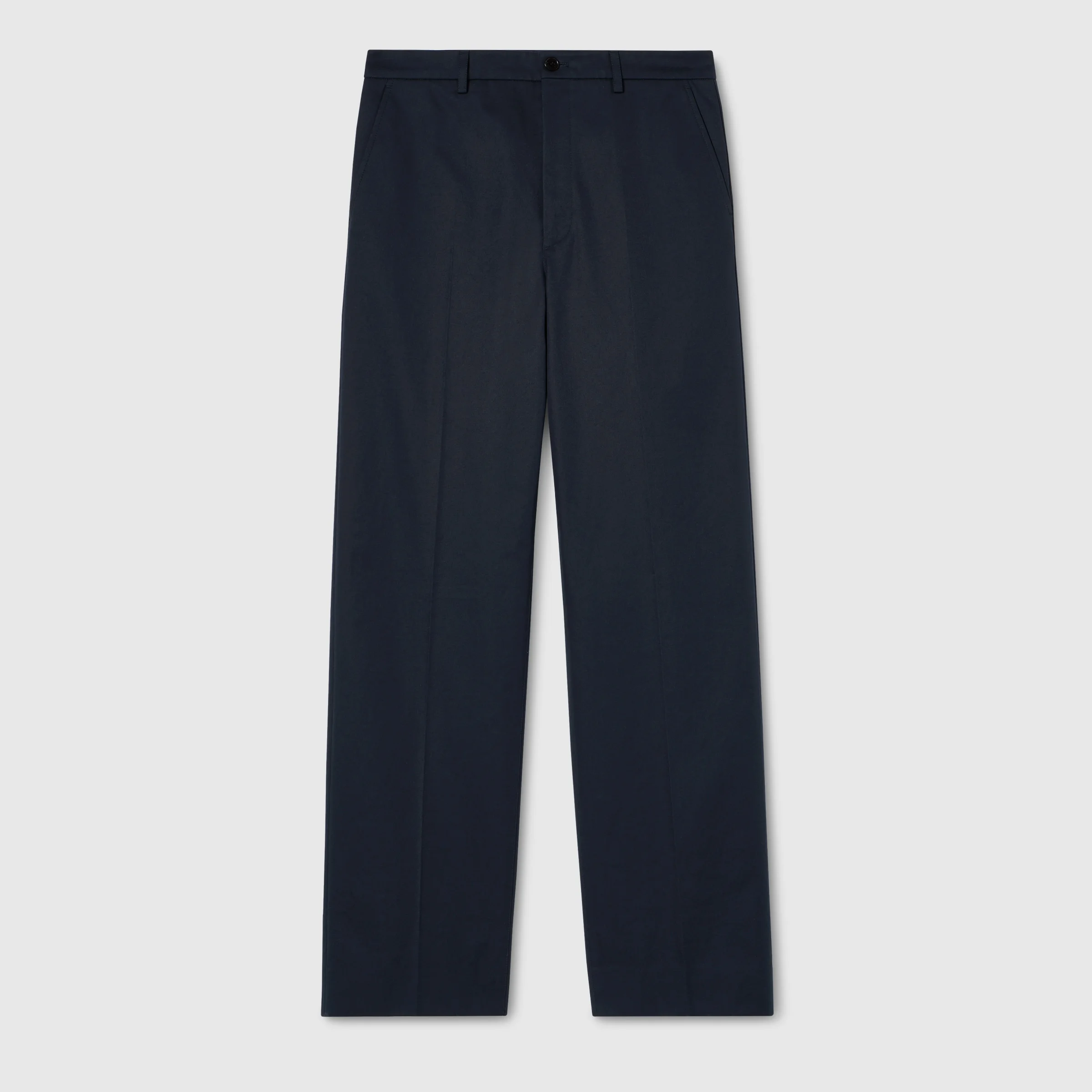 Introducing Spring Summer 2026. This style is part of the La Famiglia collection, which reinterprets the House’s codes through singular personalities and distinctive aesthetic attitudes. Crafted from cotton twill, this pair of pants is enriched with a Gucci crest embroidery. - Dark blue cotton twill - Gucci crest embroidery - Belt loops - Side and back pockets - Front button and zip closure - Length: 46.4"; Leg opening: 9.8", based on a size 44(IT) - Made in Italy - Fabric: 100% Cotton - Pocket lining: 100% Cotton - Embroidery: 100% Polyester