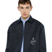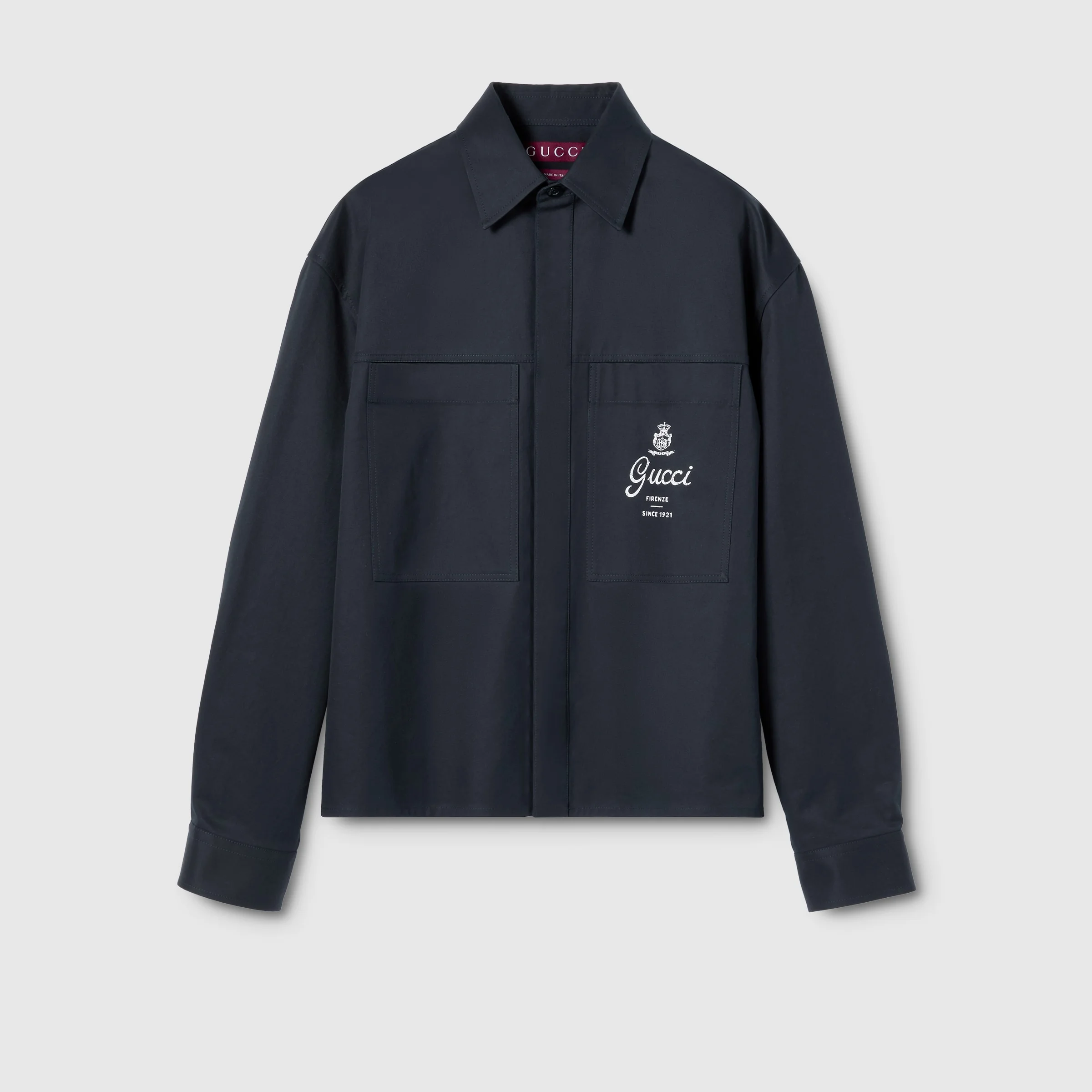 Versatile pieces made of cotton-based fabrics are embellished with an archival-inspired logo which adds a touch of flair to complete the wardrobe. Crafted from cotton twill, this shirt is enriched with the 'Gucci Firenze since 1921' print. - Dark blue cotton twill - 'Guccci Firenze since 1921' print - Point collar - Long sleeves - Front patch pockets - Front button closure - Length: 27.1"; Sleeve length: 36.2", based on a size 48(IT) - Fabric: 100% Cotton