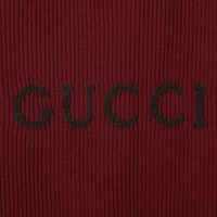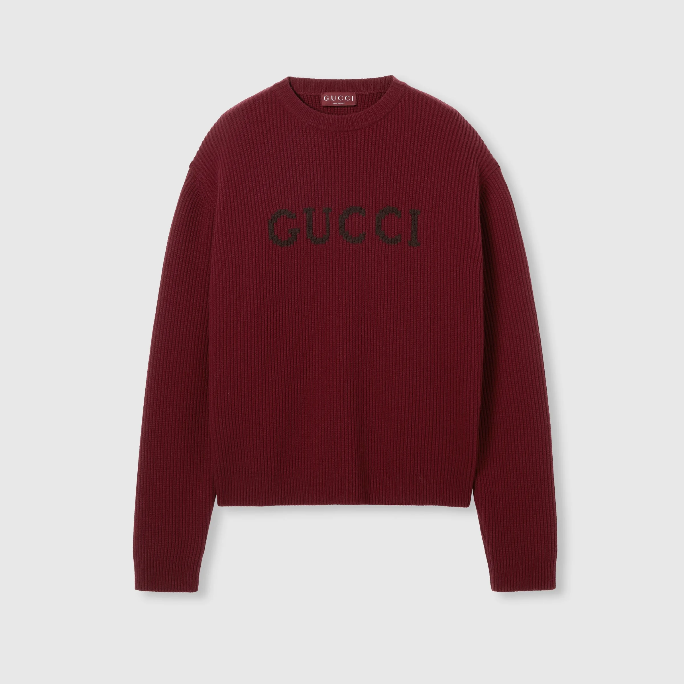 A selection of ready-to-wear pieces is enriched with heritage details of the House. Crafted from Gucci Rosso Ancora red and brown wool cashmere rib knit, this sweater is defined by a distinctive logo intarsia. - Gucci Rosso Ancora red and brown wool cashmere rib knit - Gucci intarsia - Crewneck - Long sleeves - Made in Italy
