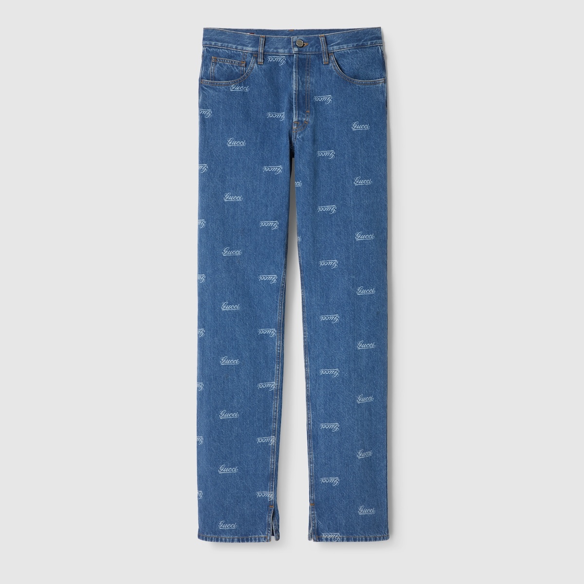 Gucci Denim Evolution is conceived by the House’s Circular Hub to reduce environmental impacts and minimize waste while enhancing craftsmanship and traceability. The collection is designed following Gucci’s circular guidelines using a denim material crafted from regenerative and recycled fibers. These straight fit pants are made from a stone washed denim with an allover Gucci script lasered. - Blue stone washed denim - Allover Gucci script lasered - Gucci jacron label - Belt loops - Five pocket construction - Washed stripe detail - Side splits - Waist: 16.1"; based on a size 31 (IT) - Hips: 19.4"; based on a size 31 (IT) - Hem width: 7.5"; based on a size 31 (IT) - Button and zip closure - Regular fit - Length: 45.5"; based on a size 31 (IT) - Leg opening: 8.2"; based on a size 31 (IT) - Made in Italy - The product shown in this image is a size 31 (IT)