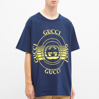 The Interlocking G is reworked in a disk-inspired print, surrounded by the word Gucci. A new motif introduced for the Pre-Fall 2020 collection, the design defines a dark blue cotton jersey T-shirt. - Dark blue organic cotton jersey - Yellow Gucci disk print - This product contains organic cotton where the cultivation and manufacturing process restrict the use of chemicals, eliminate pesticides or artificial fertilizers and incorporate methods that respect biodiversity, improve soil quality, and reduce water consumption. - Crewneck - Oversize fit - 100% organic cotton - Made in Italy - The product shown in this image is a size medium
