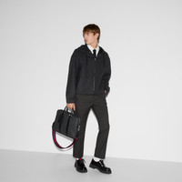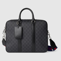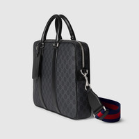The signature GG Supreme canvas remains an evergreen of the House thanks to its soft and malleable qualities. Crafted from a coated microfiber fabric, here it appears in an all black variation to define this briefcase. A tonal leather trim completes the style, while a pop of color appears in the form of the archival Web stripe. - Black GG Supreme canvas - Black leather trim - Blue and red Web - Cotton linen lining - Detachable leather ID tag - Handle drop: 3.5" - Detachable and adjustable canvas shoulder strap with 23.2" drop - Zip closure - 14.2"W x 11.4"H x 2.5"D - Made in Italy